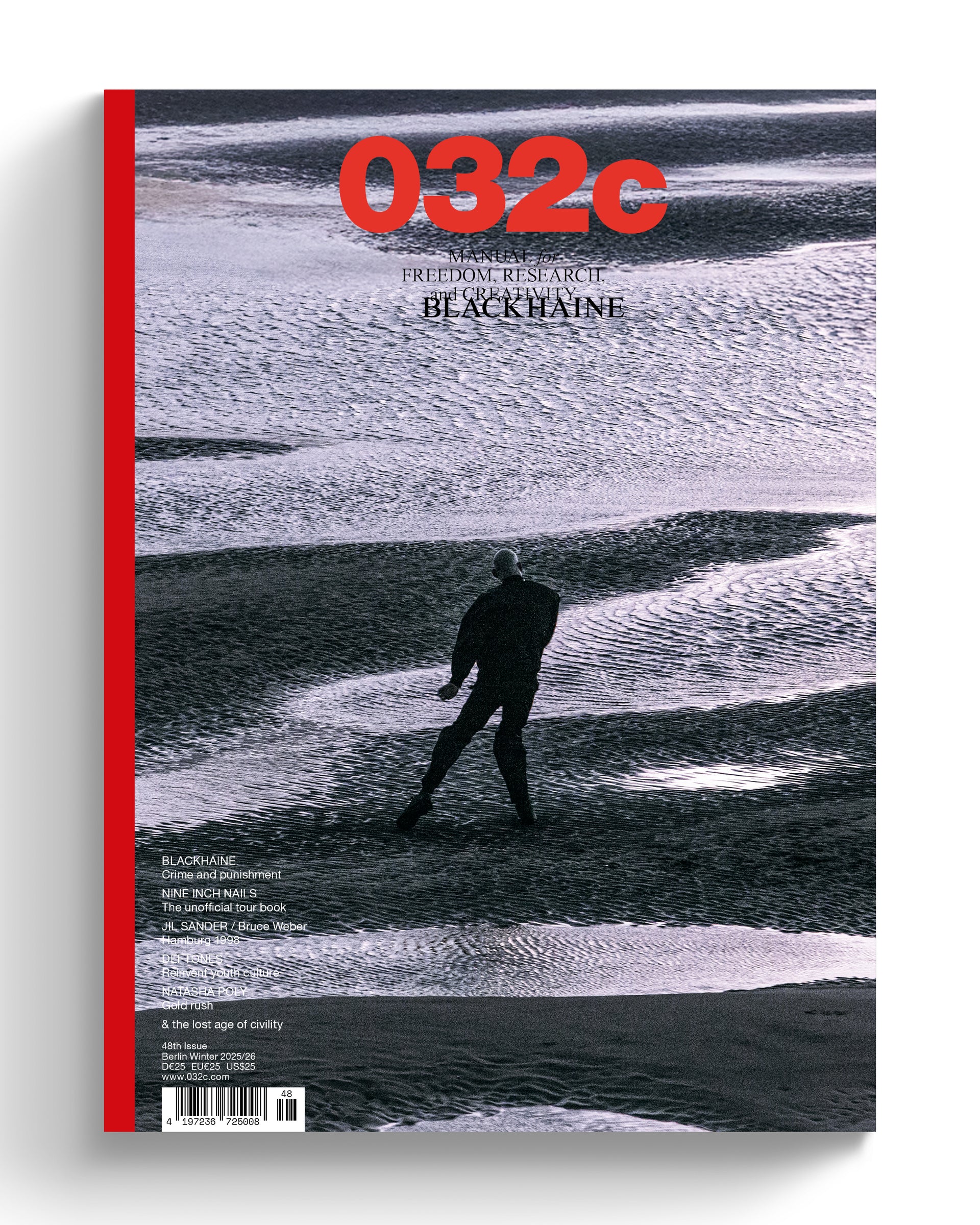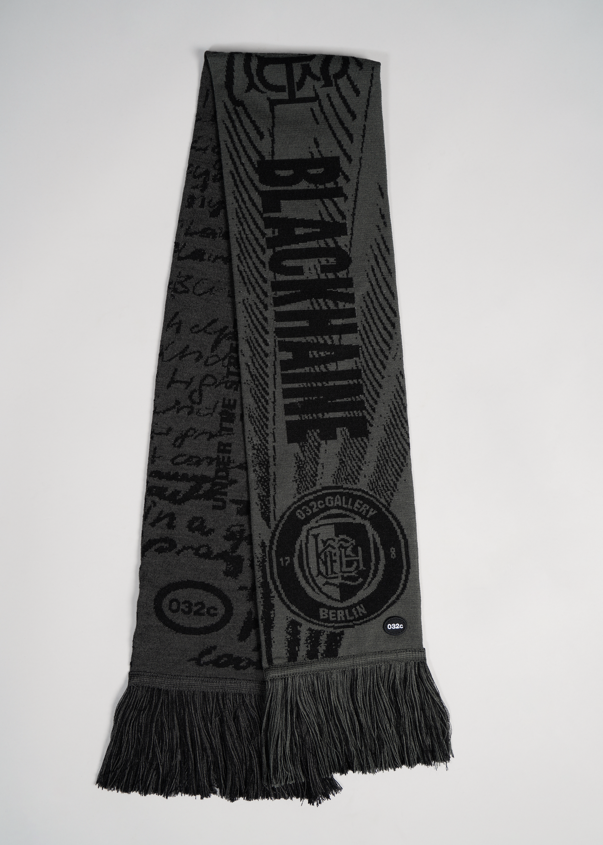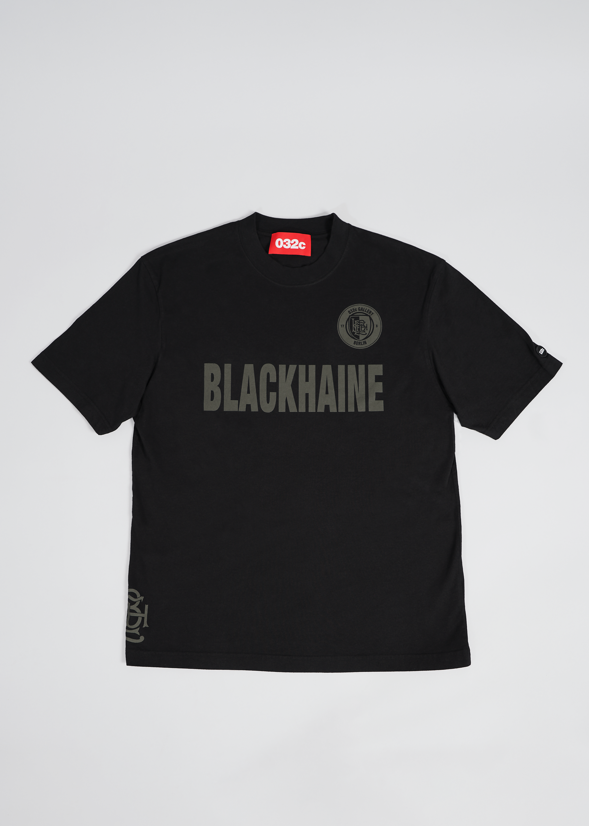 Comprising a derby scarf, t-shirt, and gloves, the three-piece capsule draws from Blackhaine’s conceptual and visual language. The graphic design weaves together references to Preston Bus Station, Ramleh, and the Glasgow Rangers, creating a dialogue between the artist’s universe and the 032c spirit.
