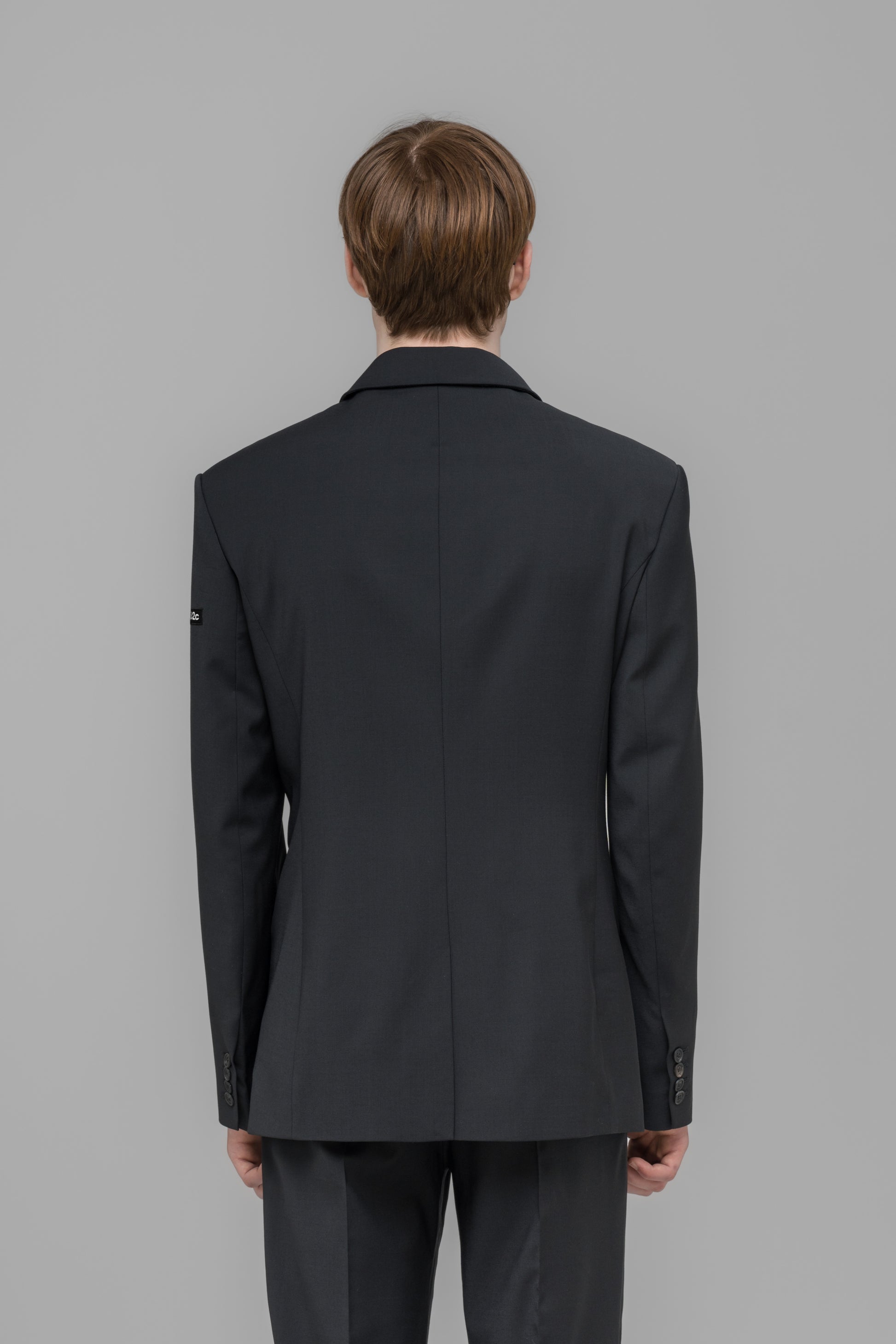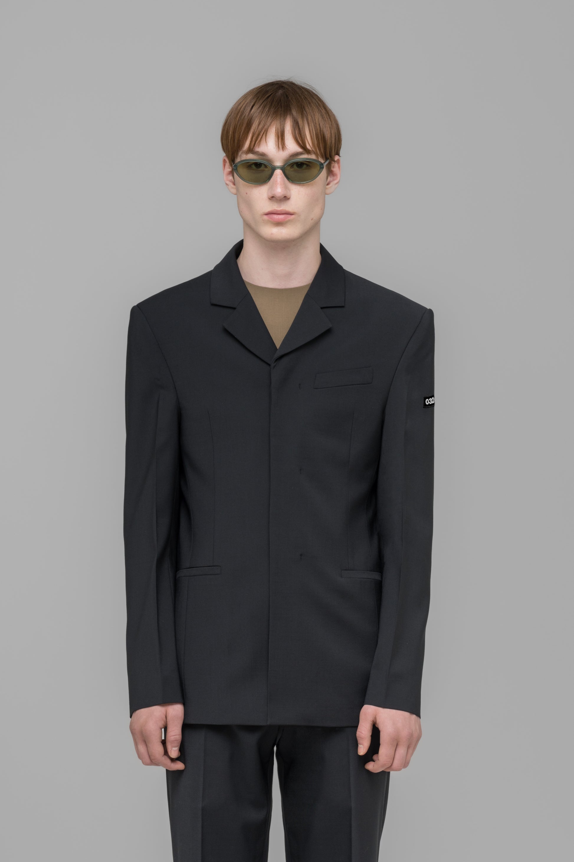 Single-breasted suit jacket with an accentuated waist. Featuring a press crease on the front sleeve, a concealed button closure with counter buttons inside, and a single vent at the back. The undercollar felt is contrasted with the embroidered 032c logo. Classic 032c branded viscose lining on the inside. Paired with our small 032c embroidered logo patch.