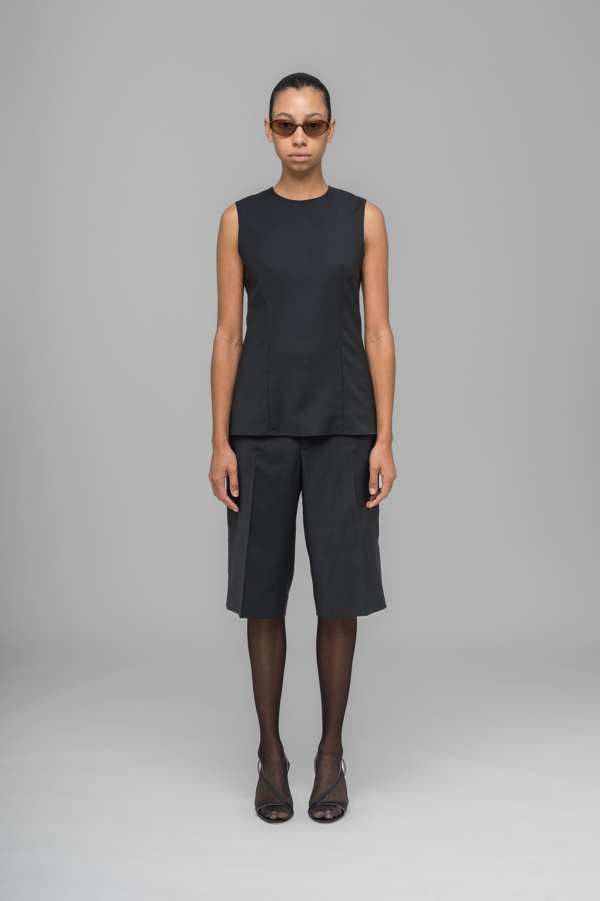 Sleeveless suit top with darts for a modern yet classic silhouette. Paired with a small embroidered 032c logo patch.