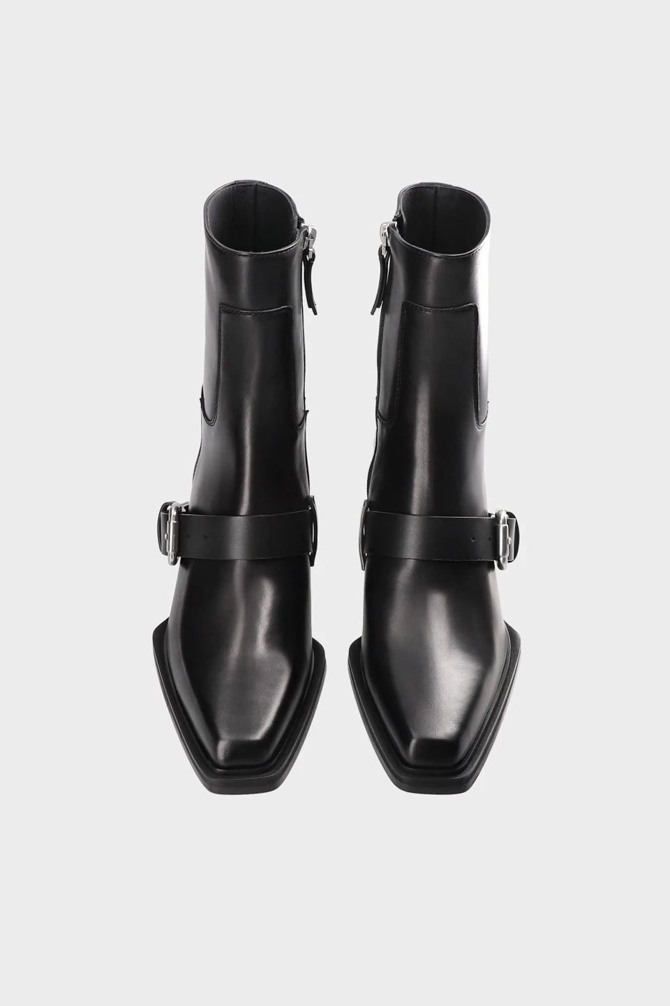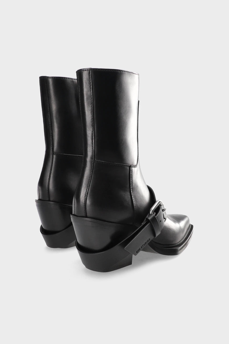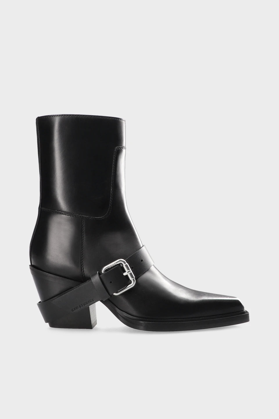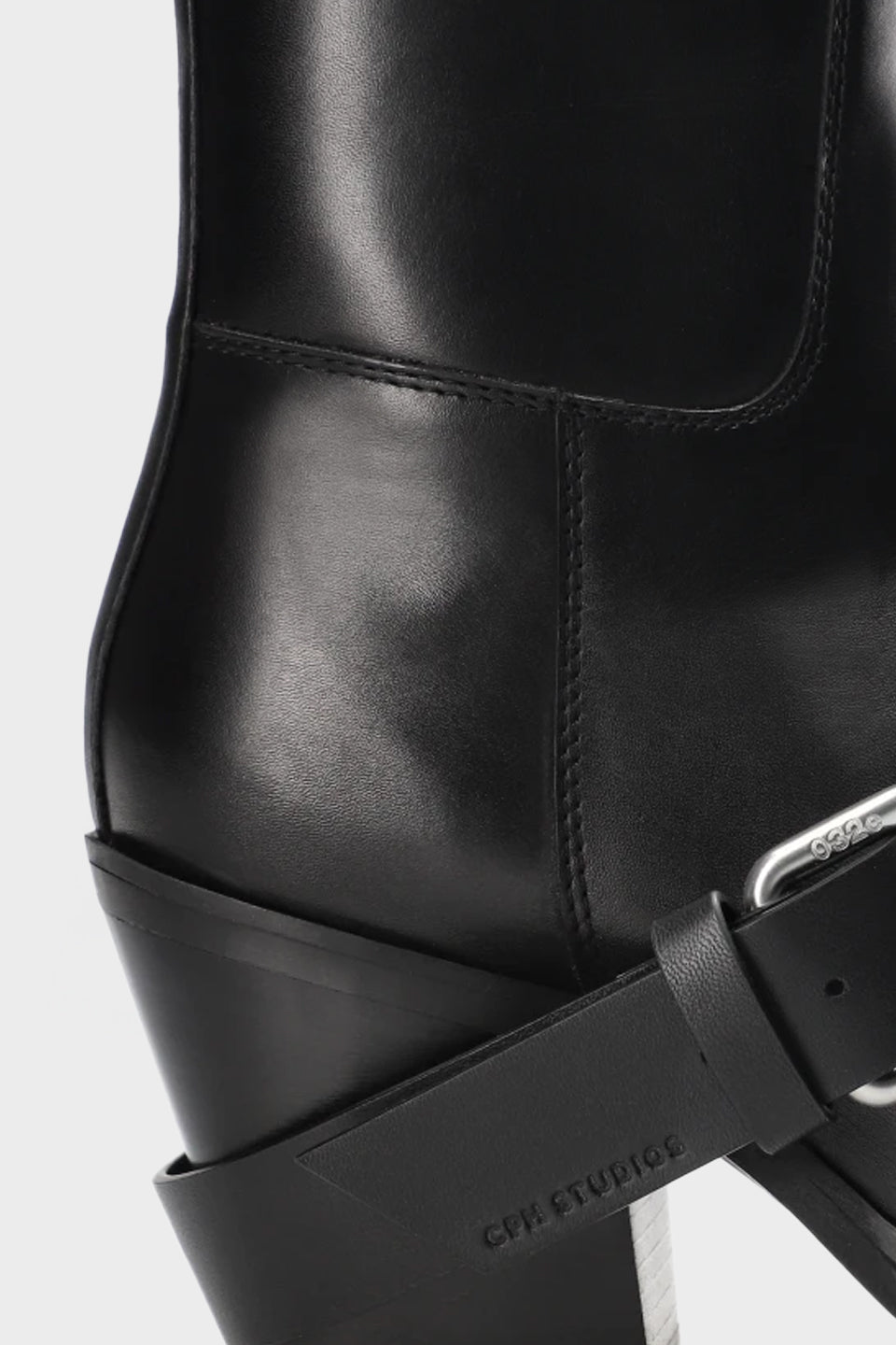 The 032c | COPENHAGEN STUDIOS ANKLE BOOTS with buckle are handcrafted in Italy from the finest smooth leather and adorned with biker-inspired metal accents. They feature an embossed 032c logo on the sole and a Copenhagen Studios logo on the leather strap.