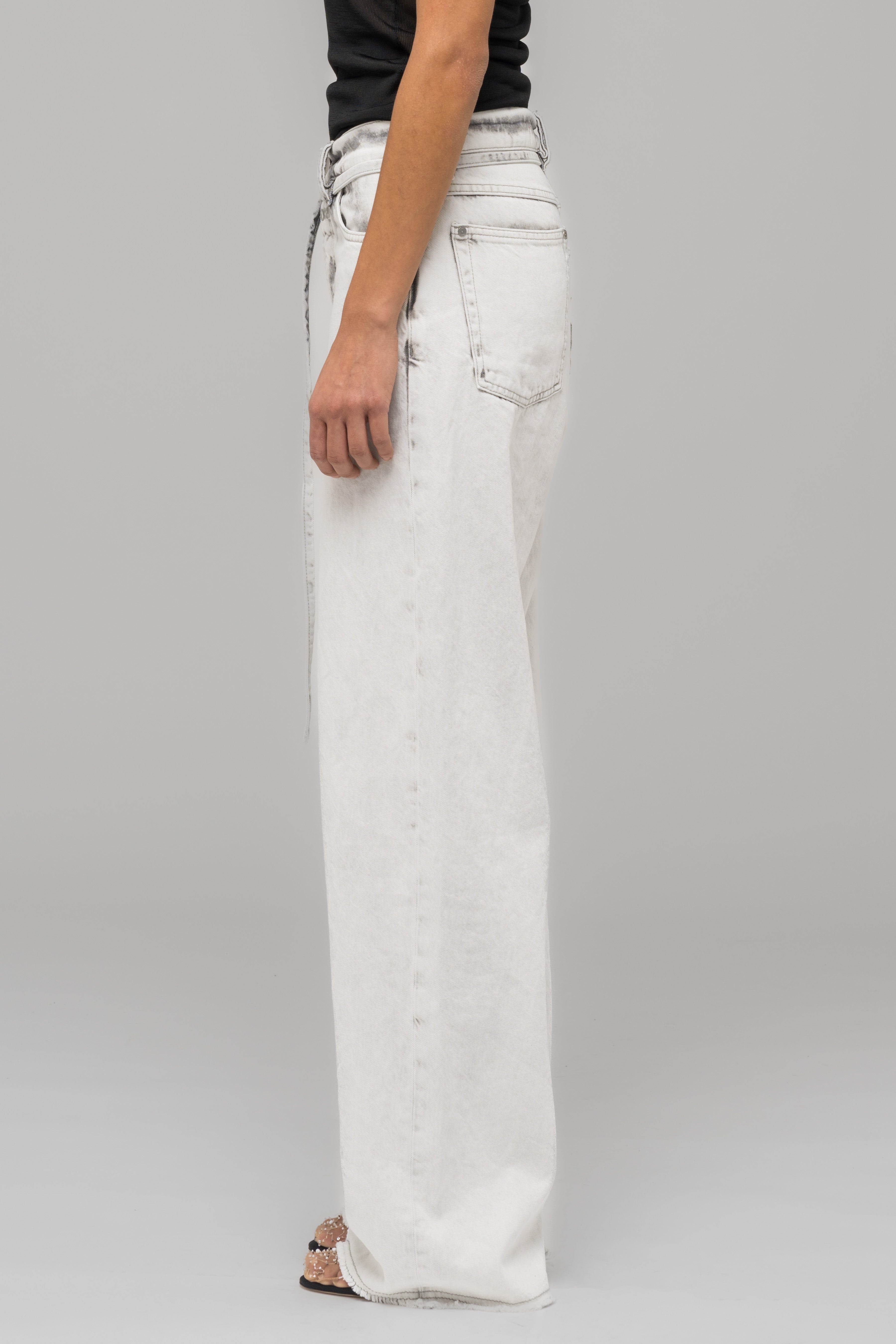 Oversized, low rise loose cut denim pants in white with our seasonal grey stain treatment. Featuring 5 pockets and a tonal logo embroidery paired with a 032c leather patch on the back waistband.
