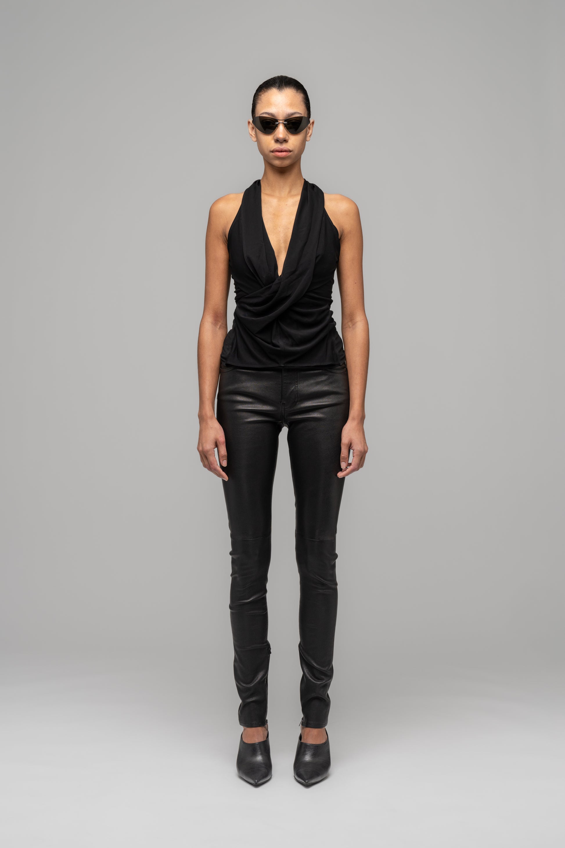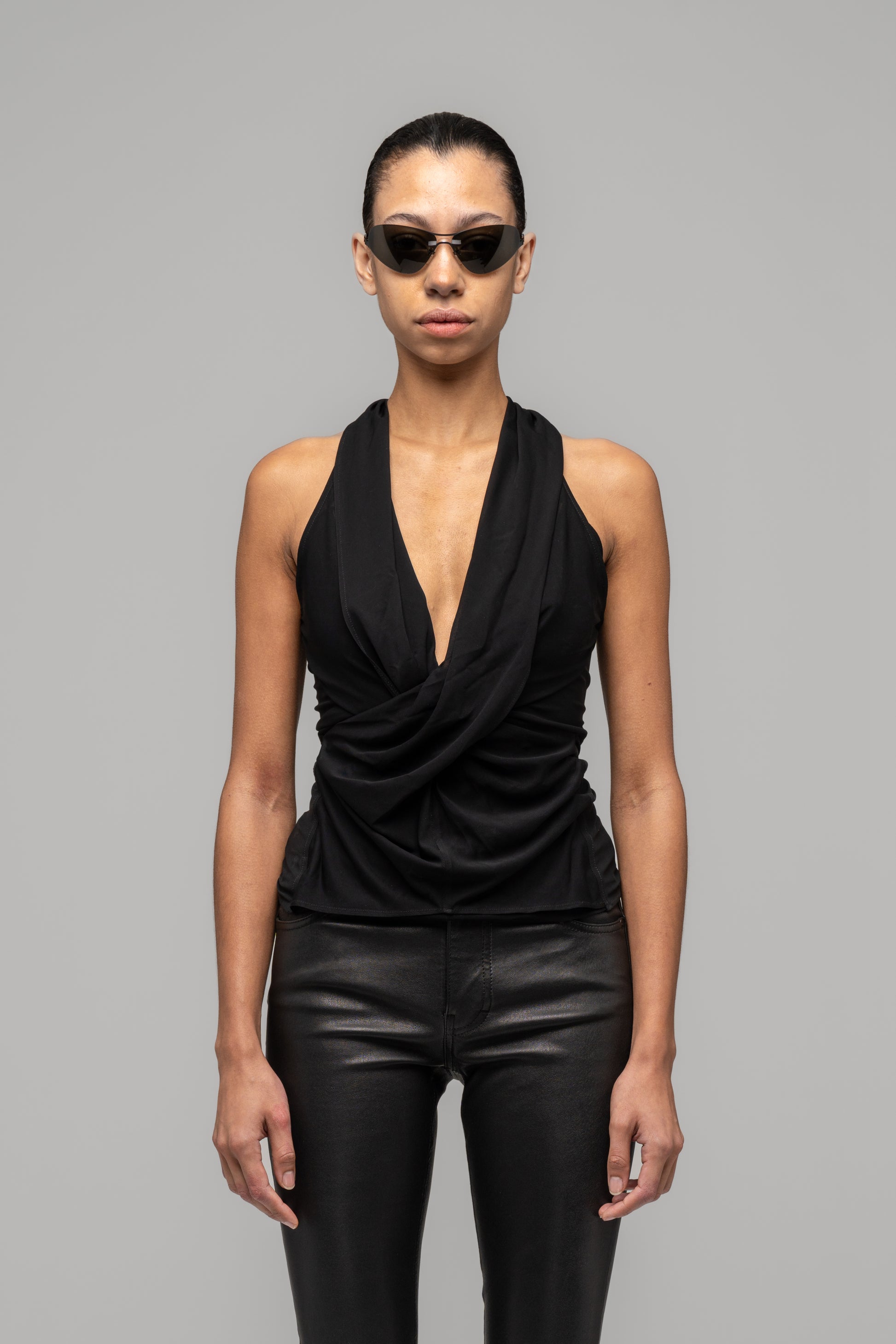 This superfluid and draped evening top is made out of thin tech jersey fabric to provide a modern look.