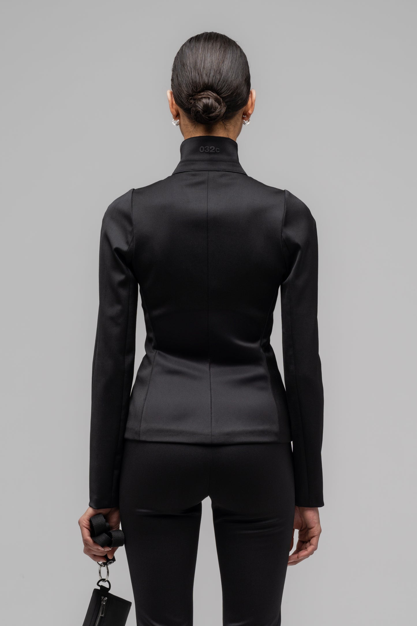 Tight cut suit jacket made from Italian stretch wool with a silky feel. Inward curved armhole detail and top collar closure create a shrunken silhouette. Branded button front closure.