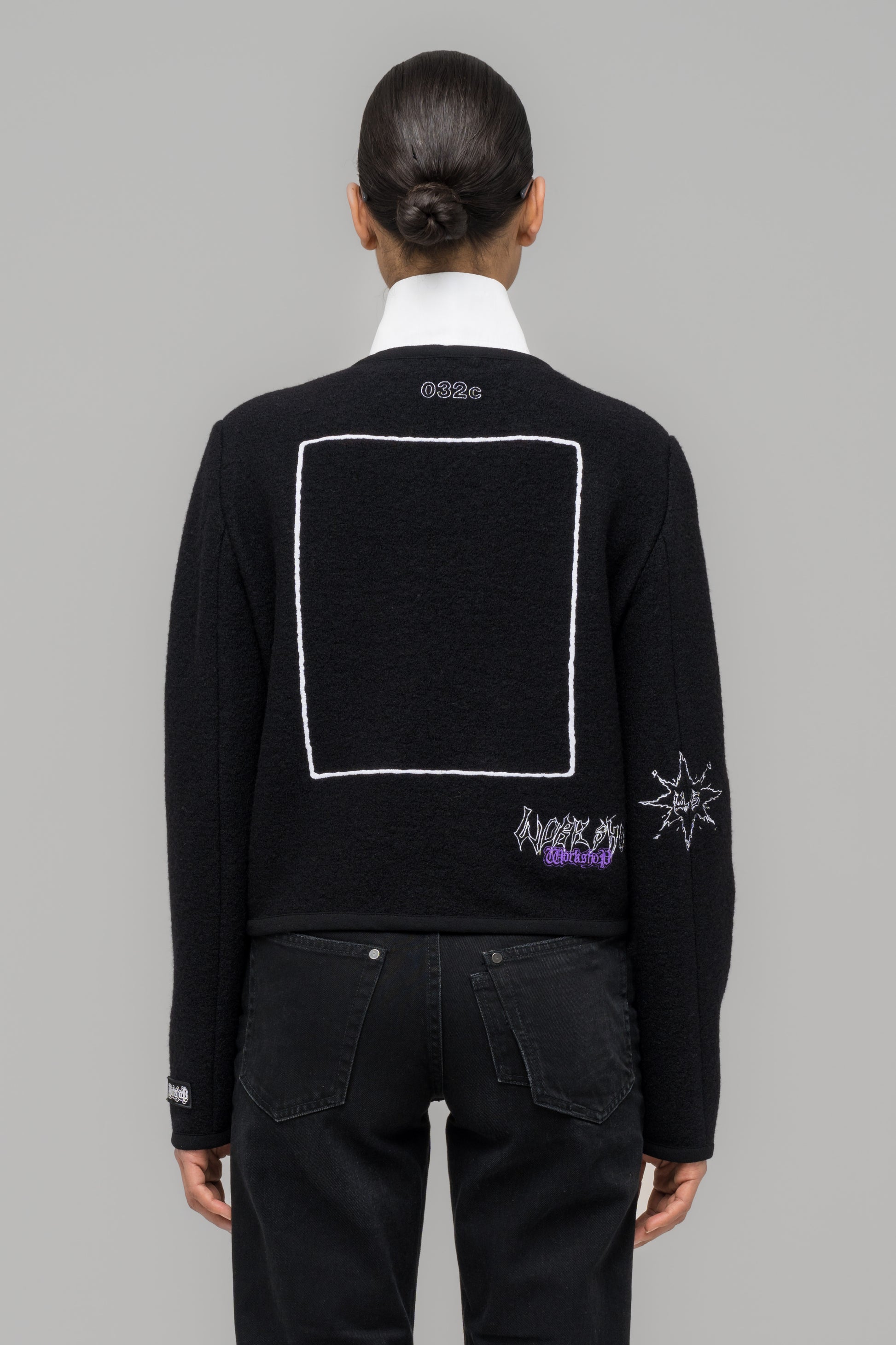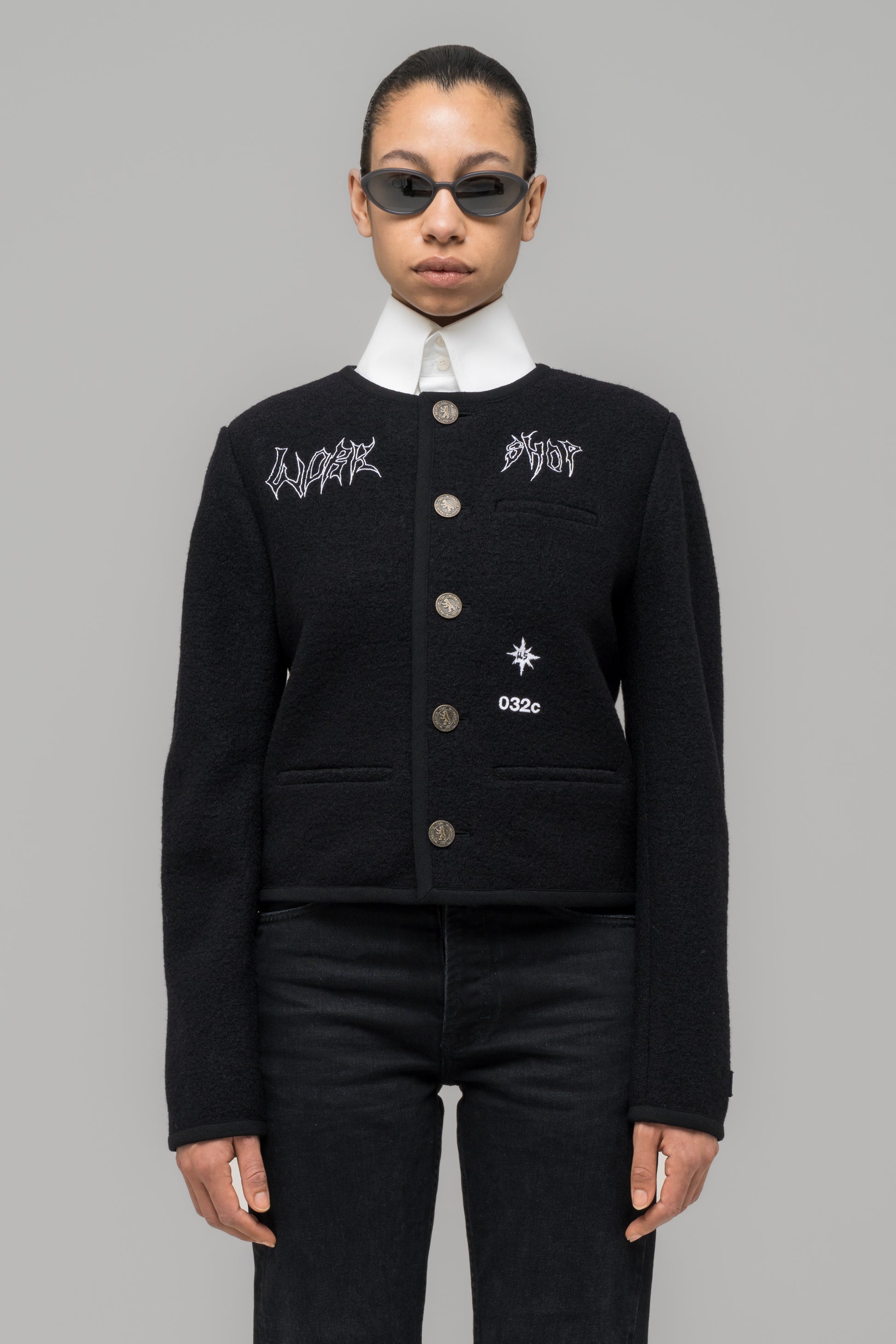 A modern take on a traditional style, crafted in a boiled wool fabric with bound edges and front welt pockets. The janker is equipped with metal branded buttons, 032c logo embroideries and a Workshop patch on the sleeve.
