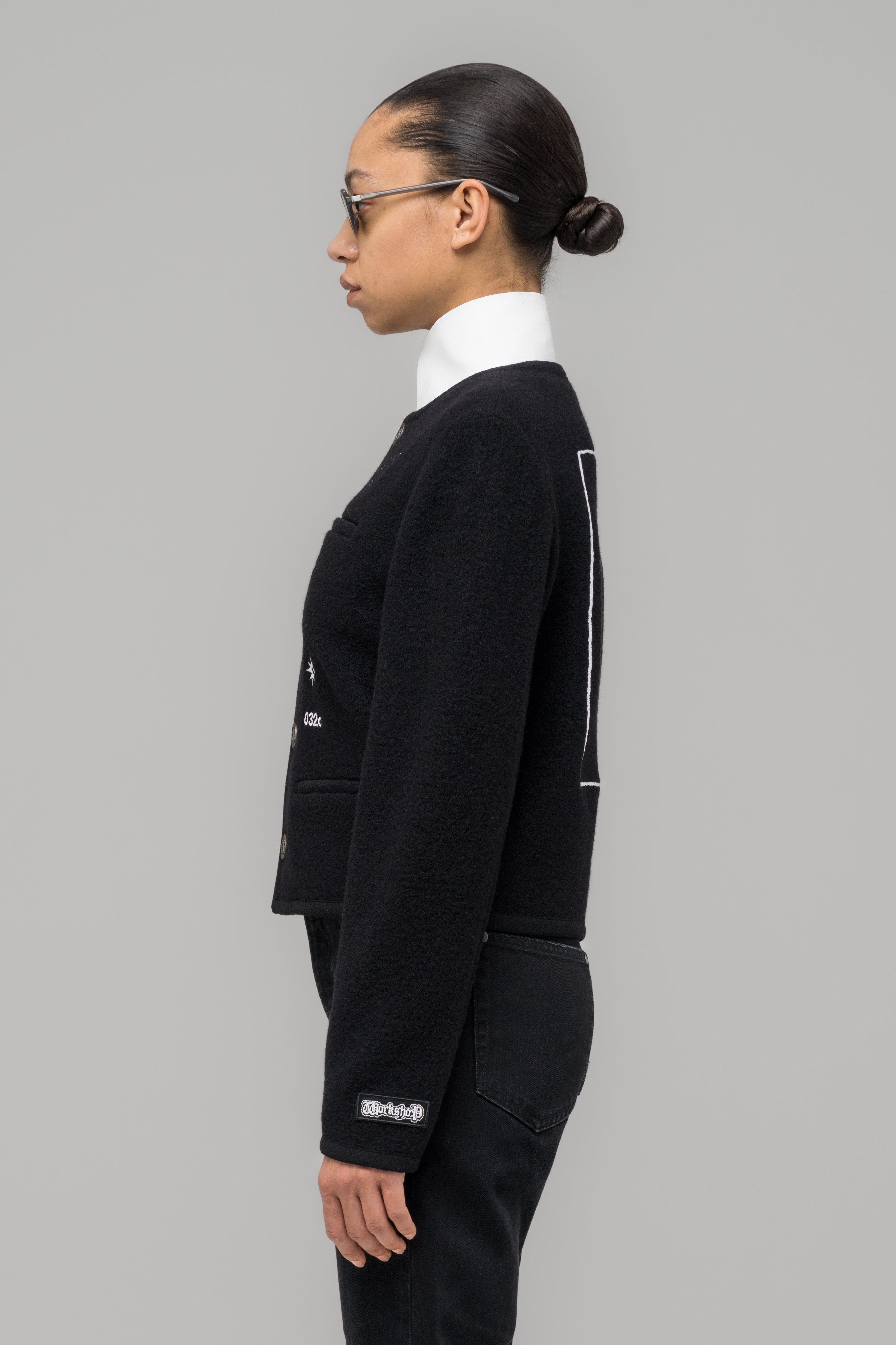 Janker in boiled wool with bound edges and welt pockets, featuring metal branded buttons, 032c logo embroideries, and a Workshop sleeve patch.