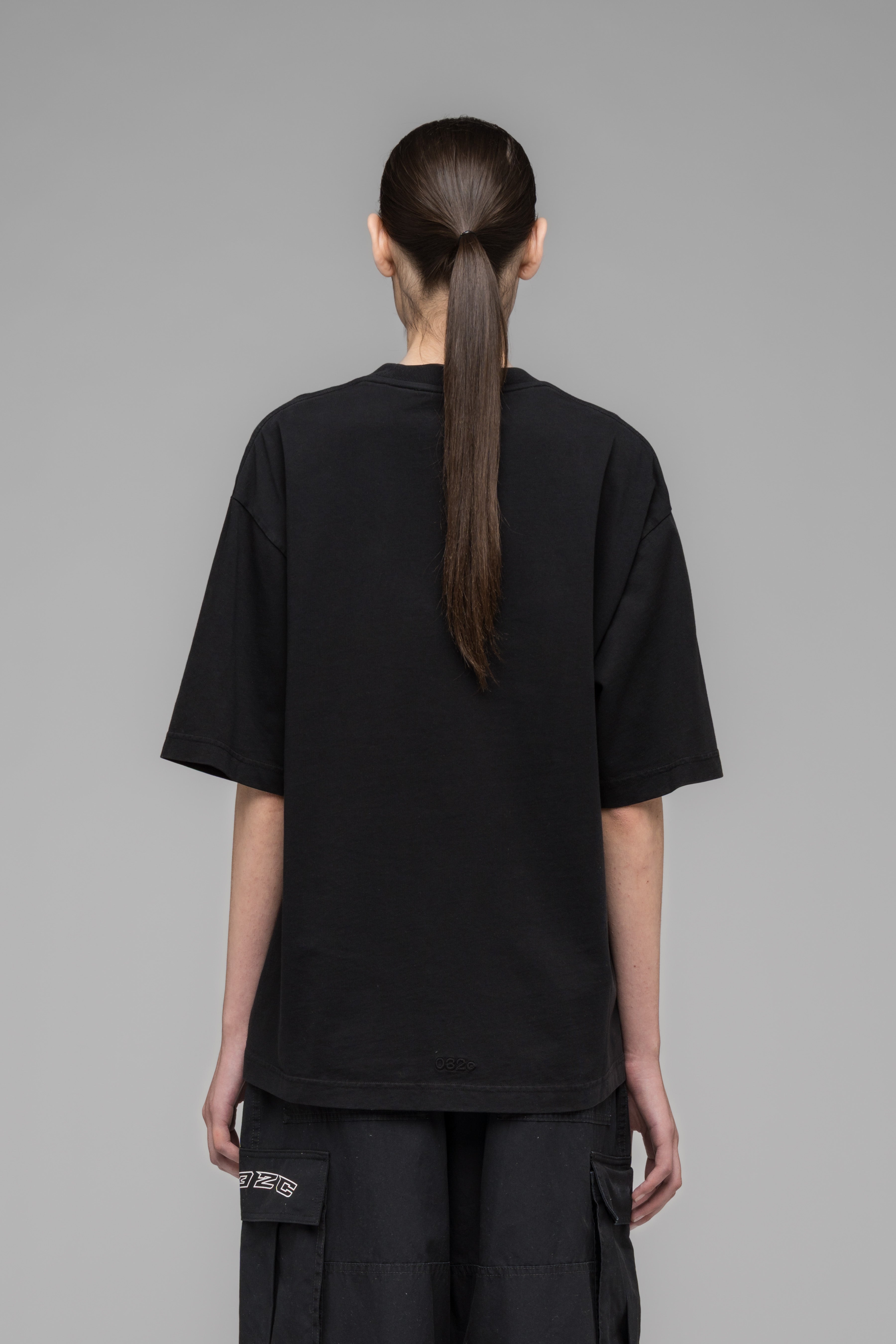 Regular-fit washed black t-shirt in mid-weight organic cotton jersey with a smooth, soft feel, featuring a “032c Hardcore Since 2001” print and an embroidered 032c logo at the back hem.