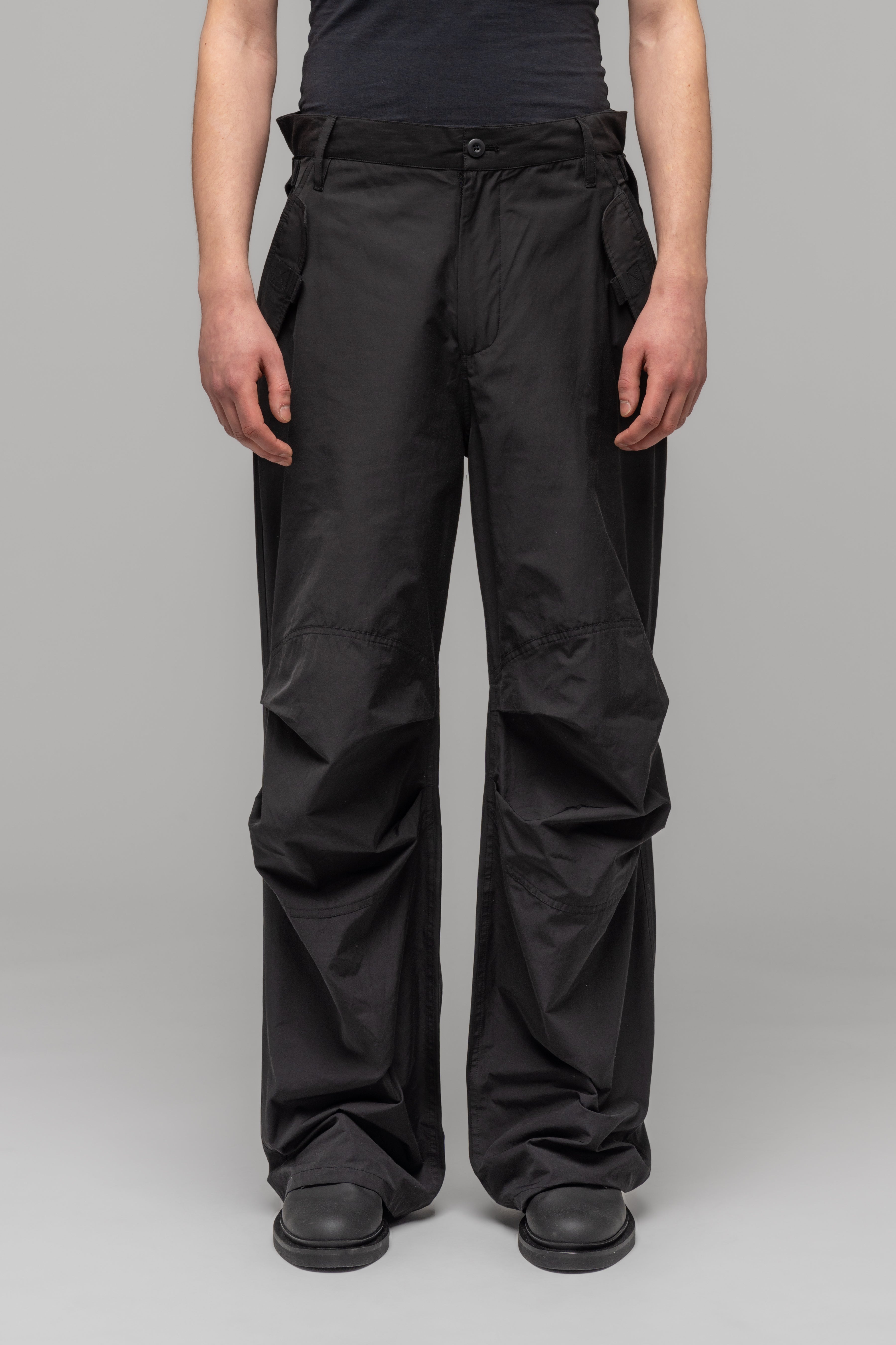 Oversized cargo style wide leg trousers. Exaggerated knee with volume pleats. Front pockets with small integrated lighter pockets under the flaps. Waistband gathering on the back with help of an adjustable strap.