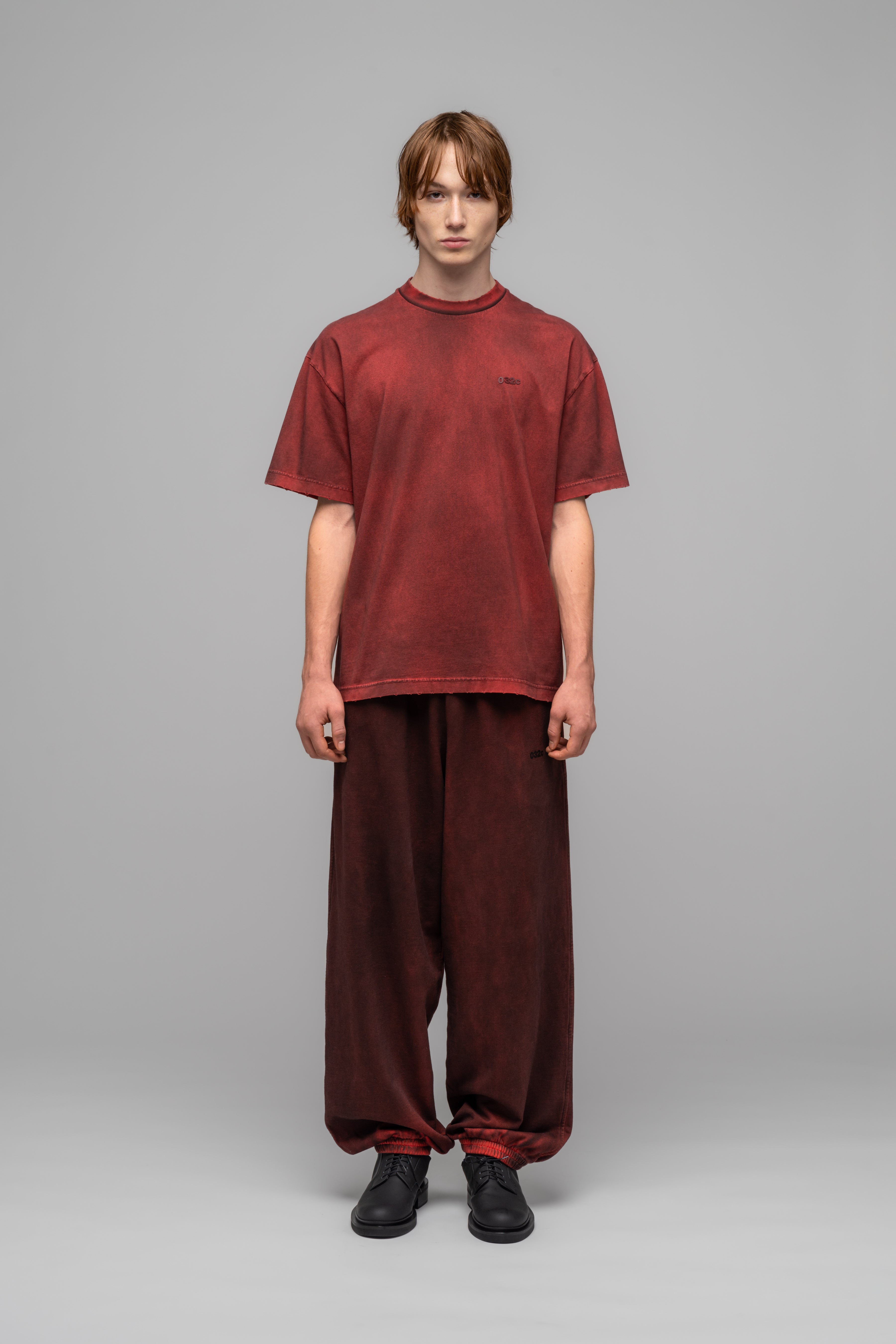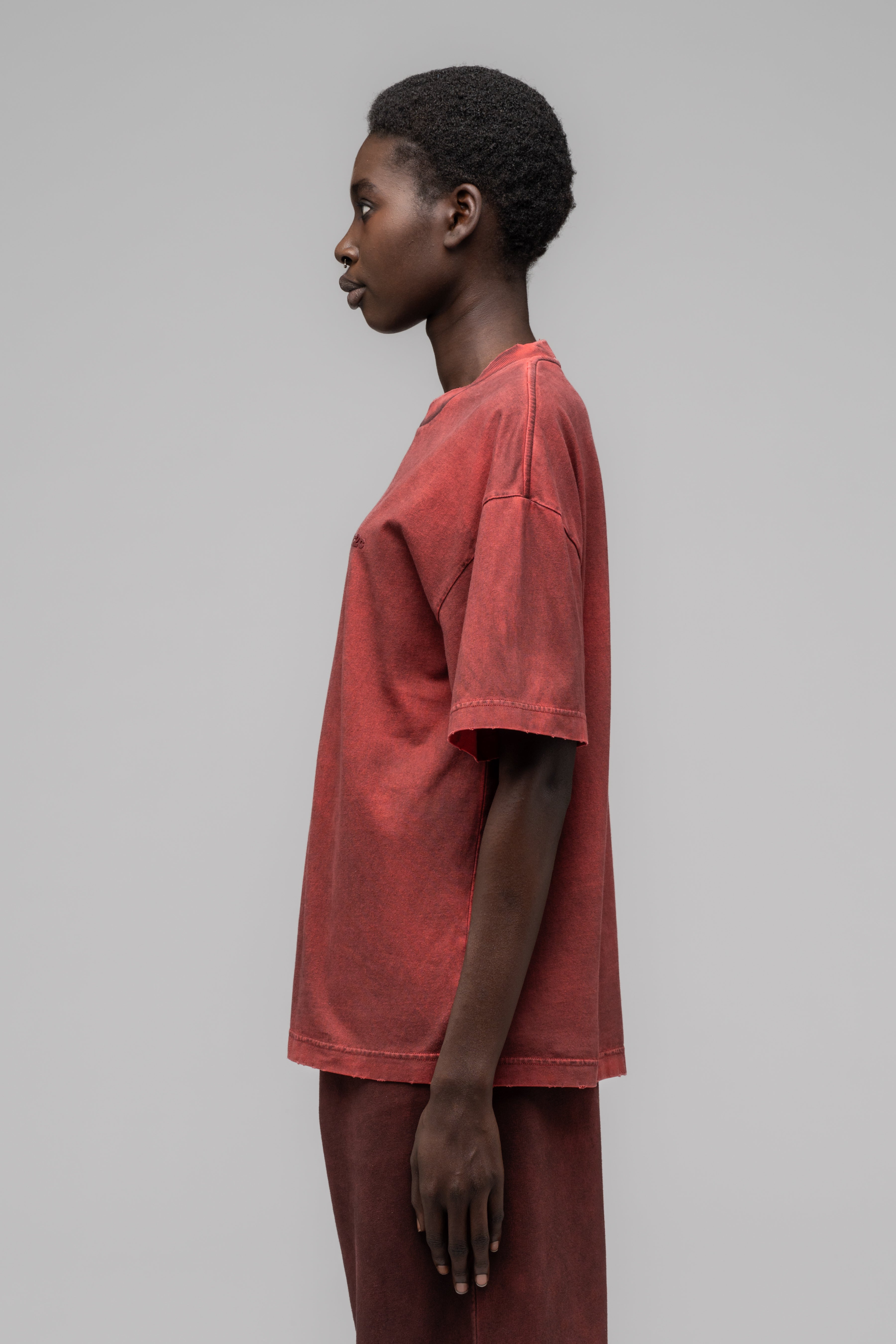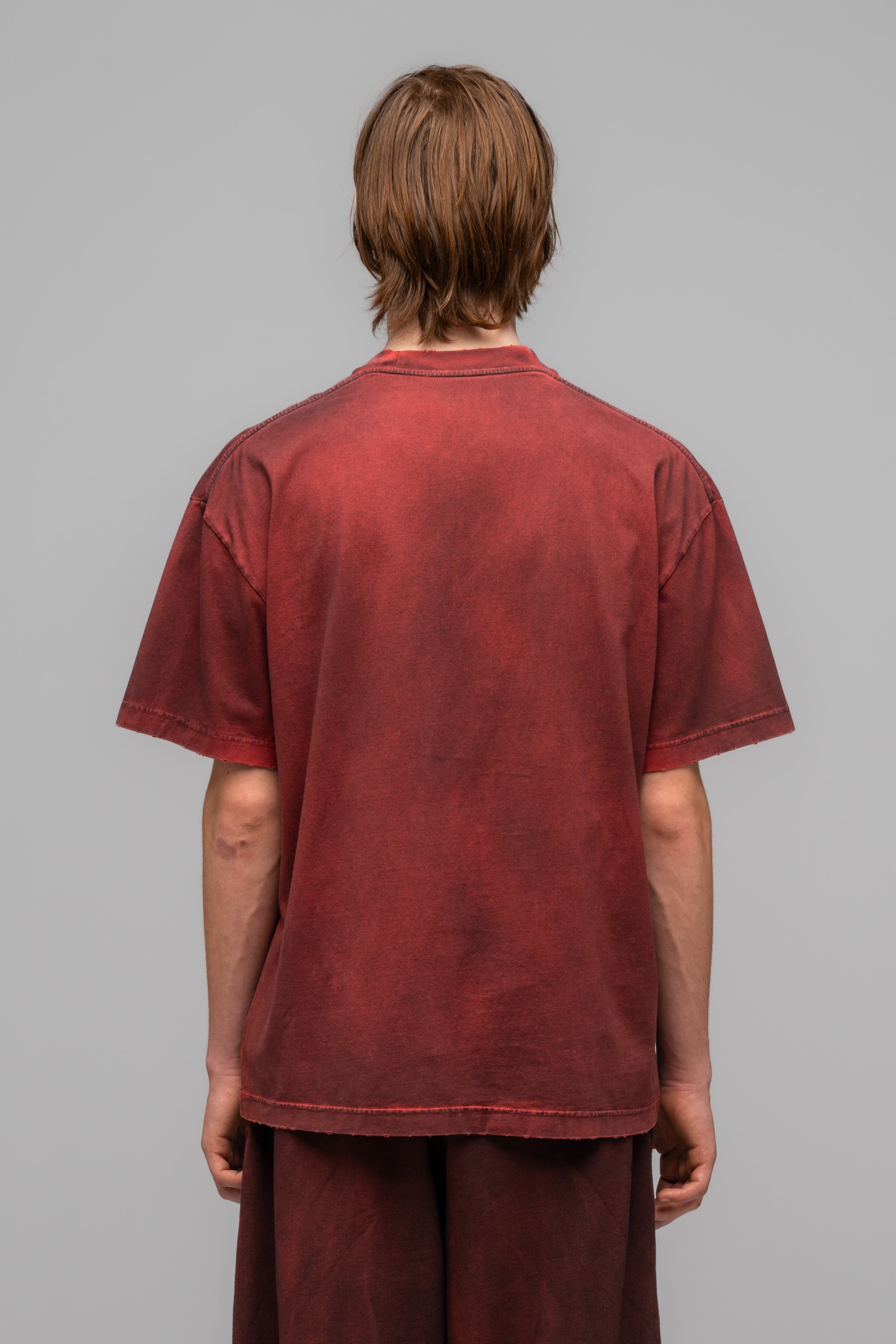 This distressed regular cut t-shirt comes in a stained red for an overall vintage feel.