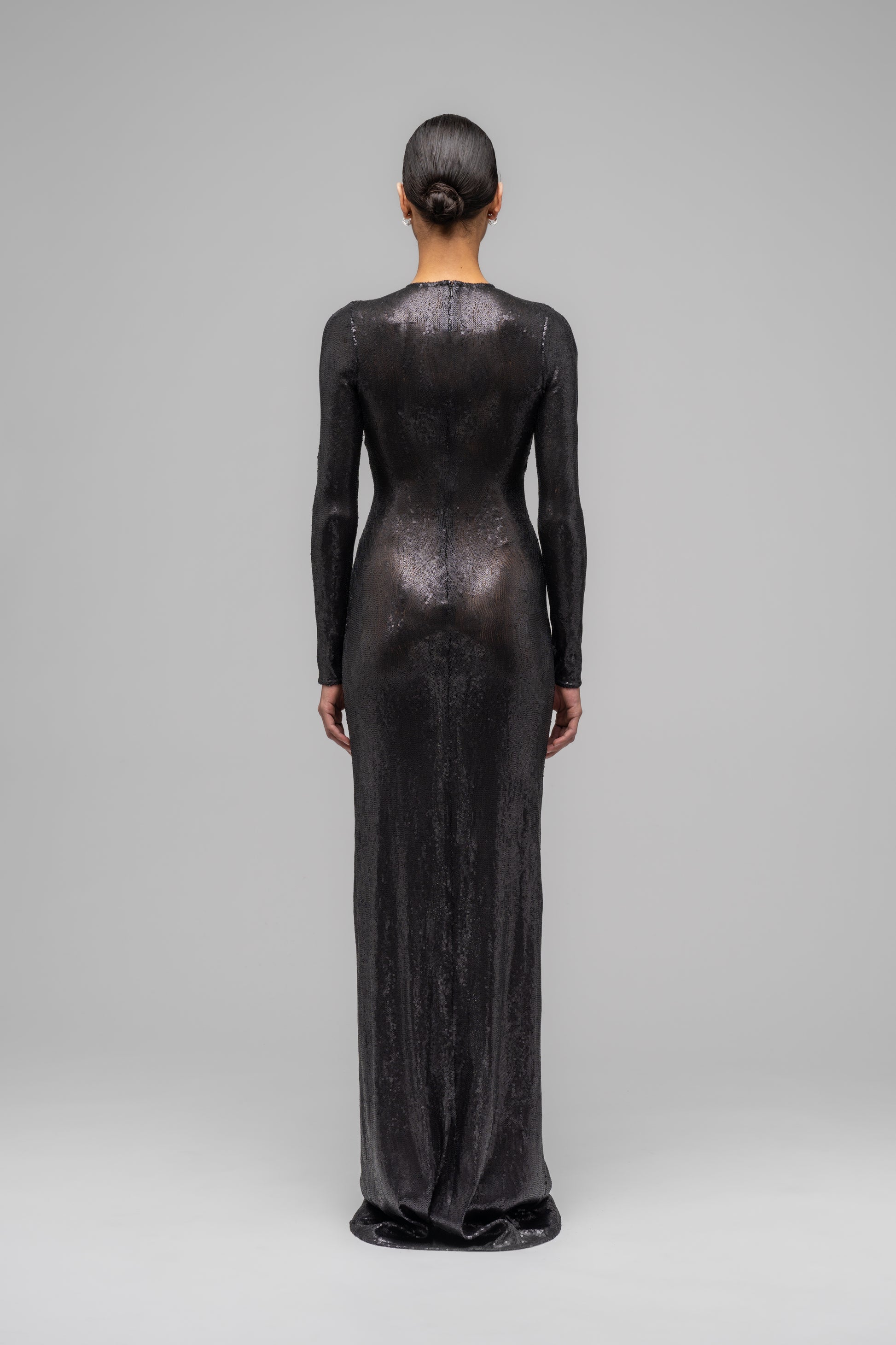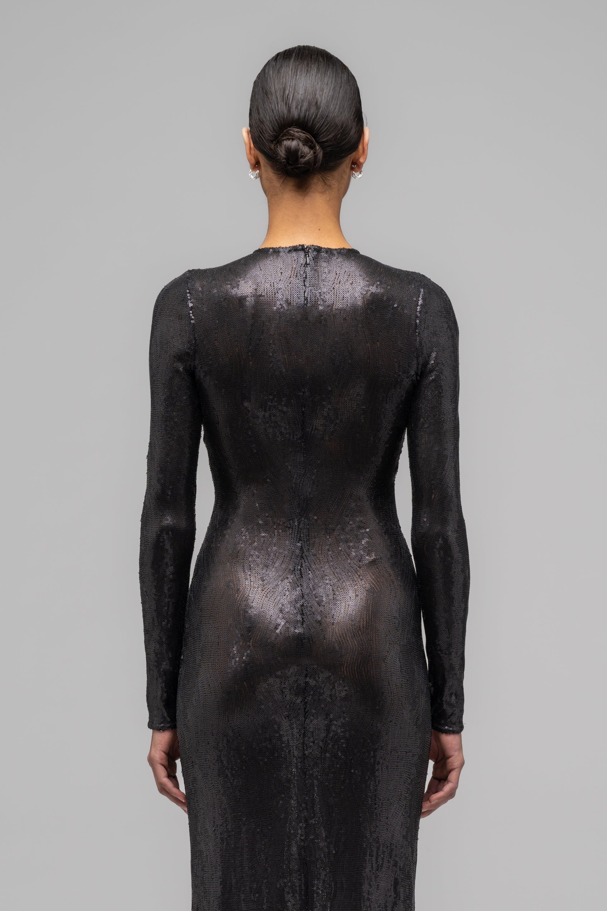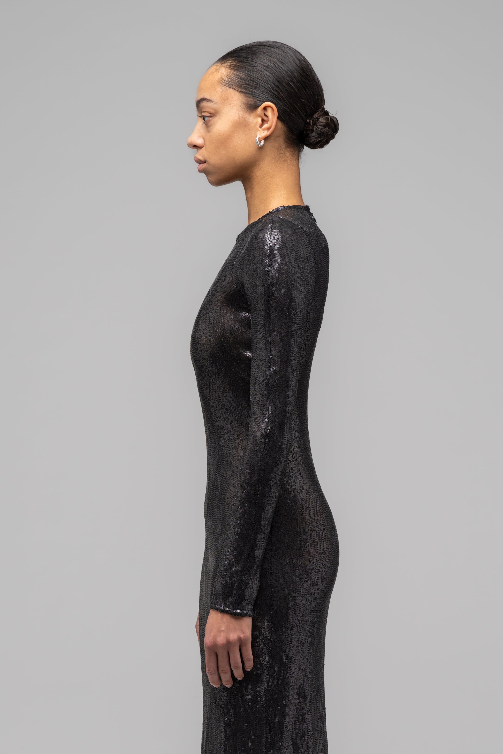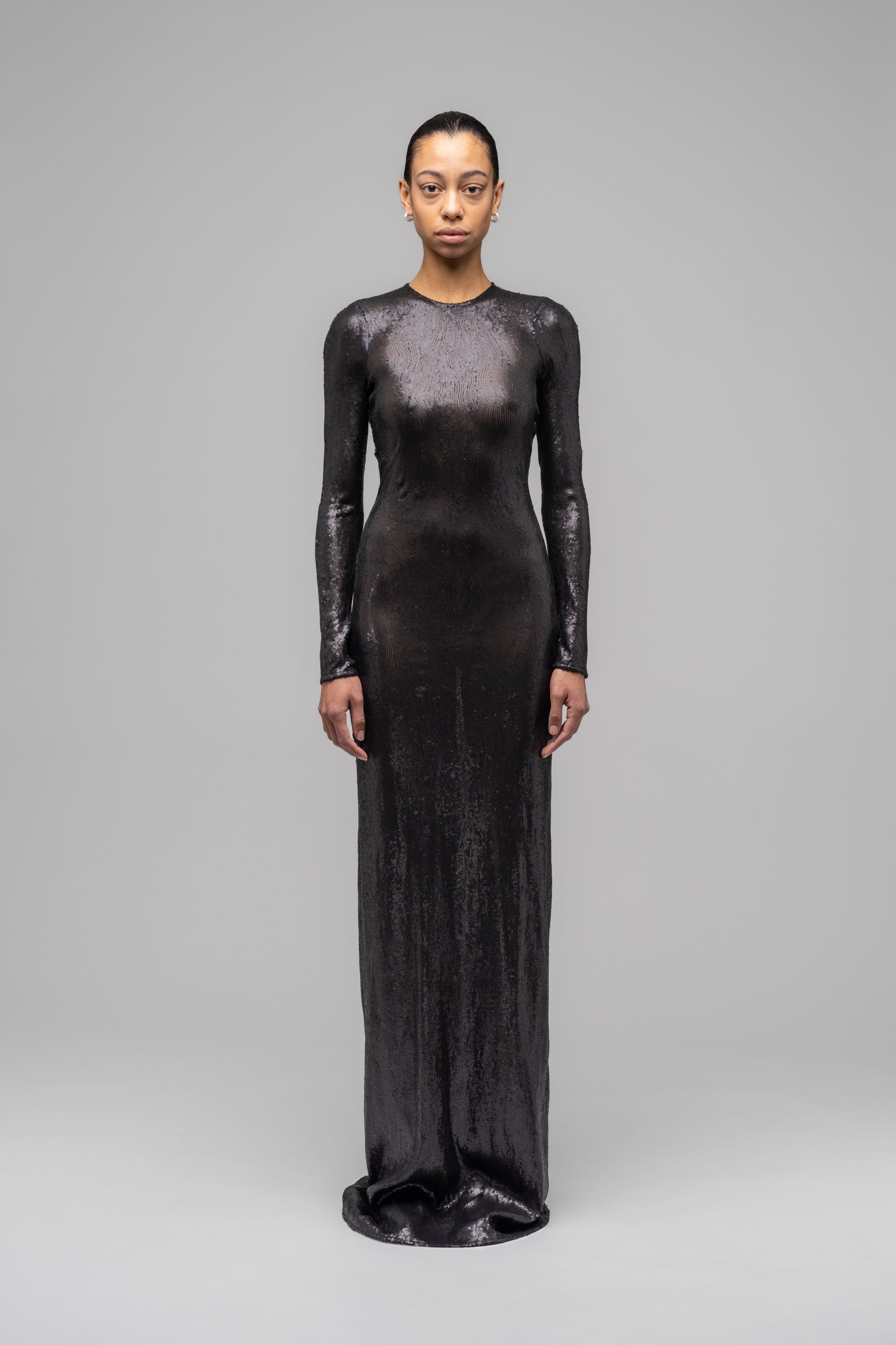 Tight fit, longsleeve dress made out of sequined spandex mesh. Inward curved armhole detail creates a shrunken silhouette, despite the full length of this elegant dress. Concealed zipper at the back.