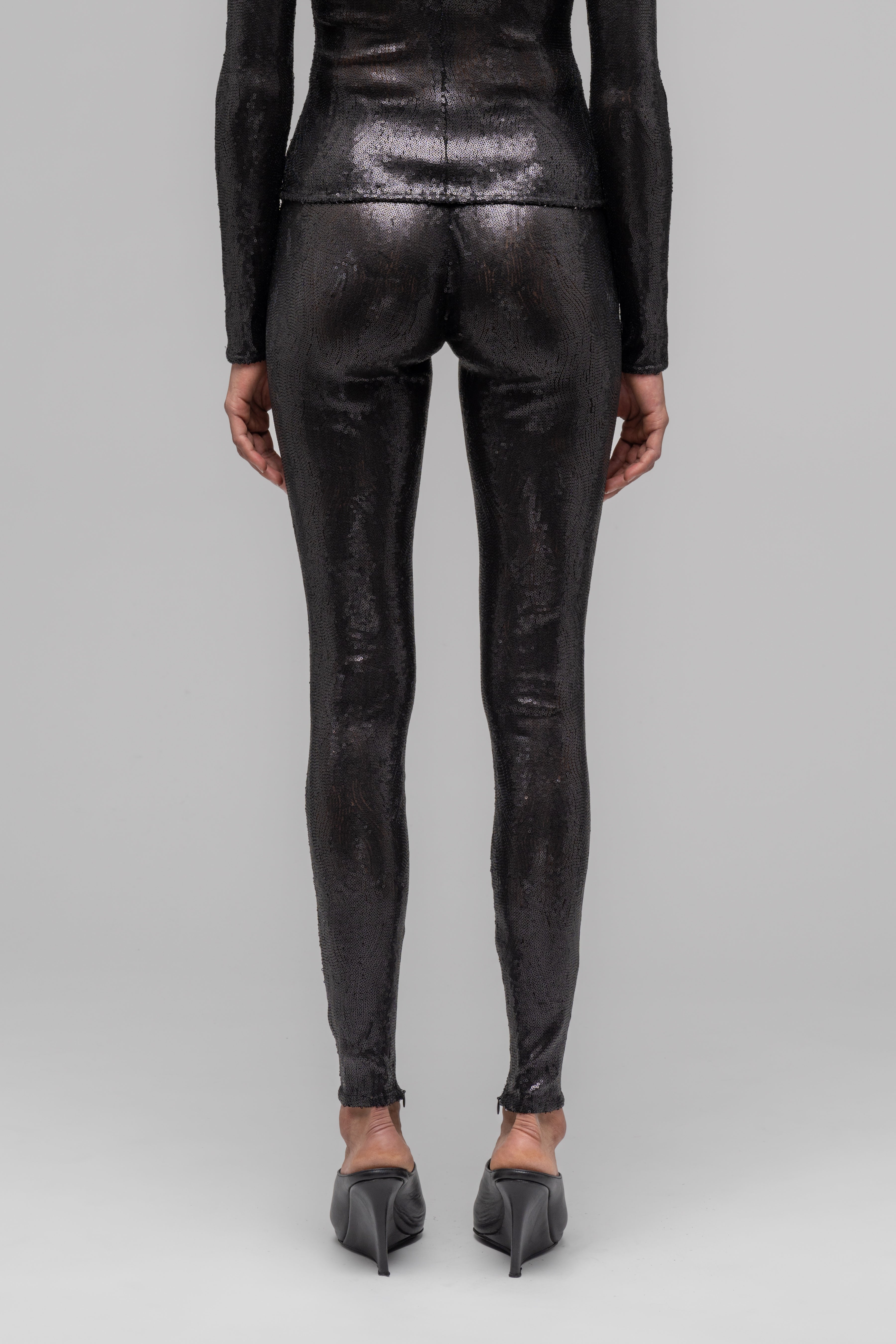 Super tight and stretchy sequined trousers. Elasticated waistband and concealed zipper that allows you to slide in smoothly. Concealed zippers at leg openings.
