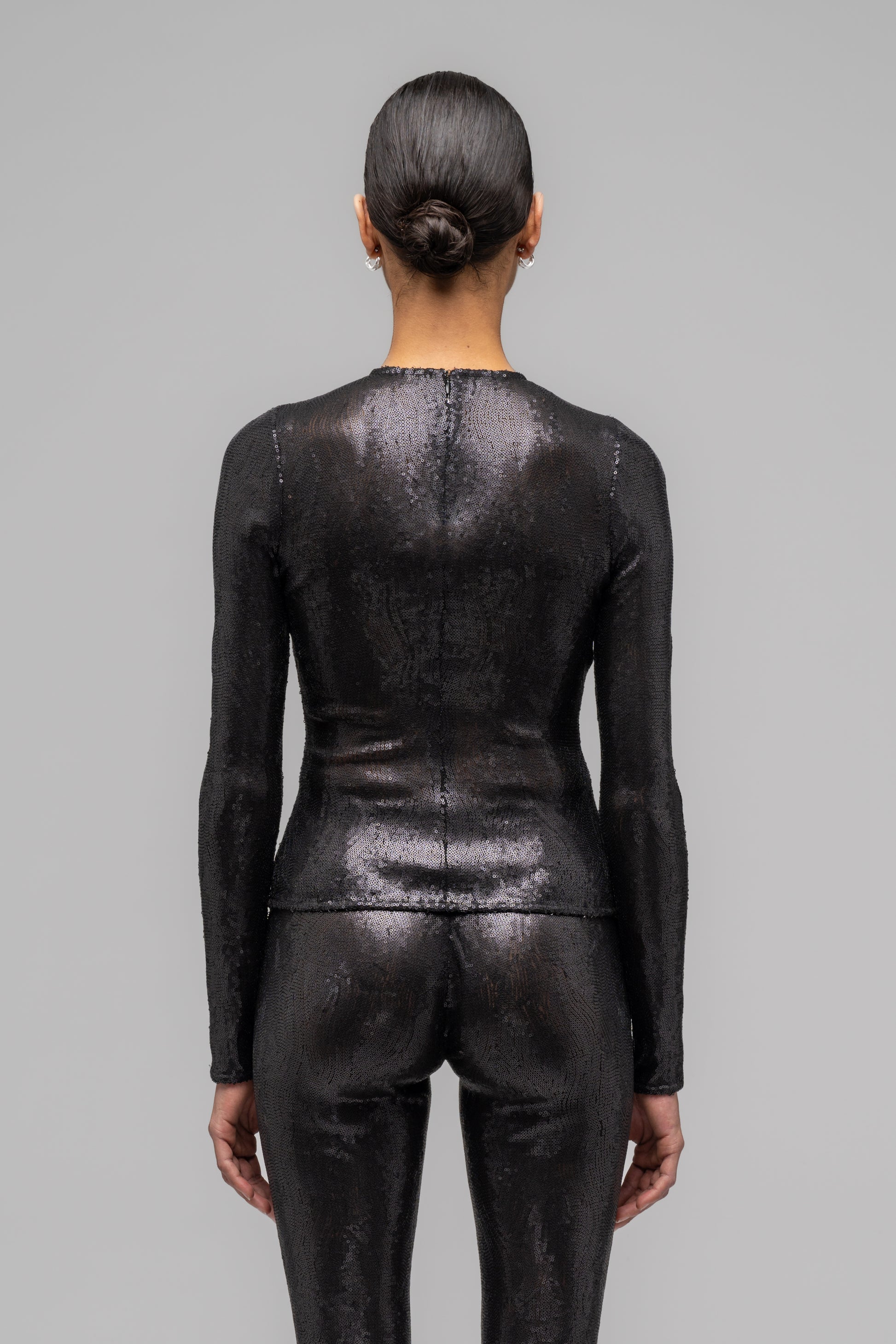 Tight fit, longsleeve evening top made out of sequined spandex mesh. Inward curved armhole detail creates a shrunken silhouette. Concealed zipper at the back.
