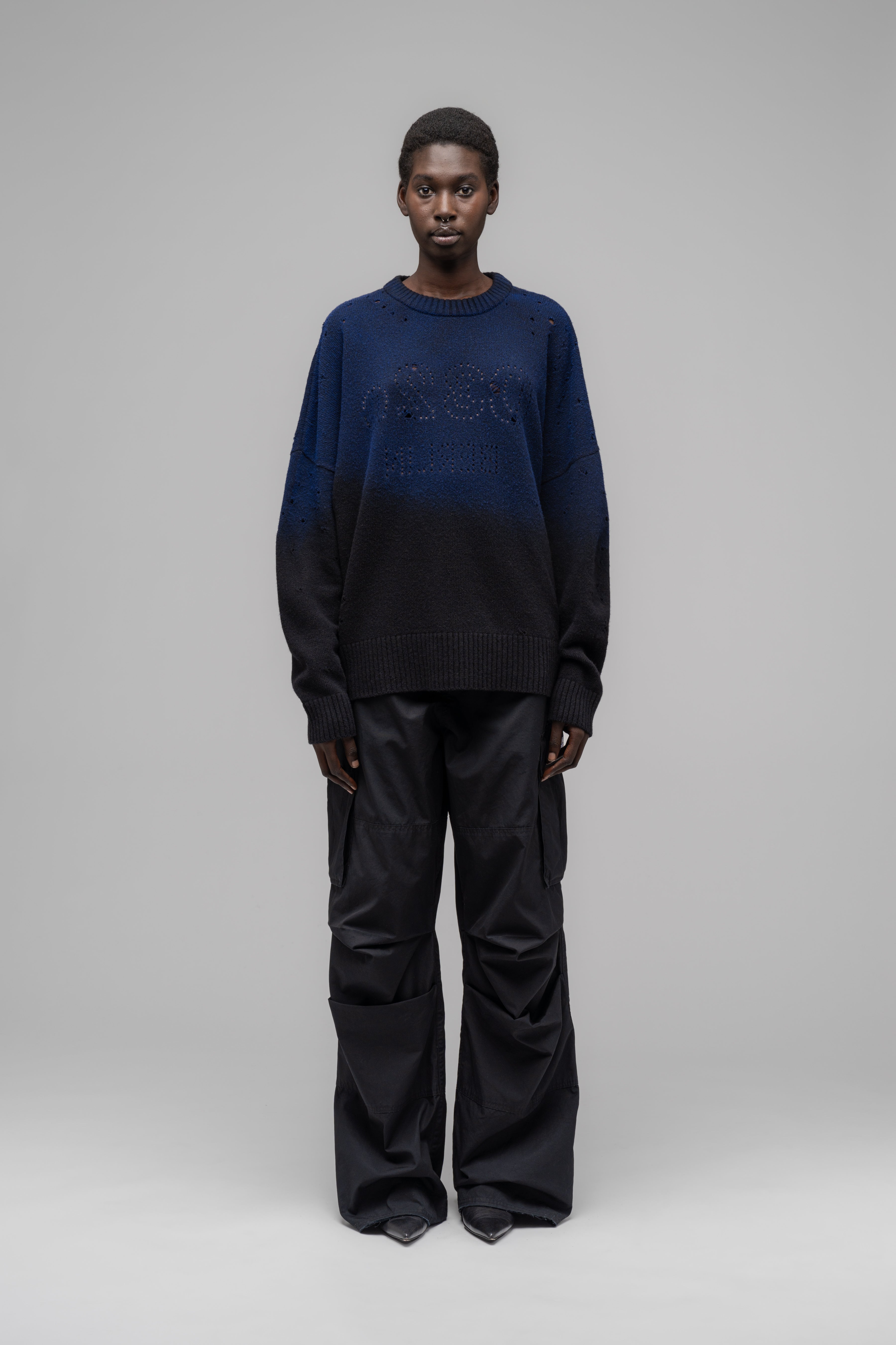 Seasonal variation of our all-time favorite sweater, made from extrafine wool yarn. Dark blue spray treatment on the top section creates a color gradient towards the hem. Distressing at the top and sleeves.