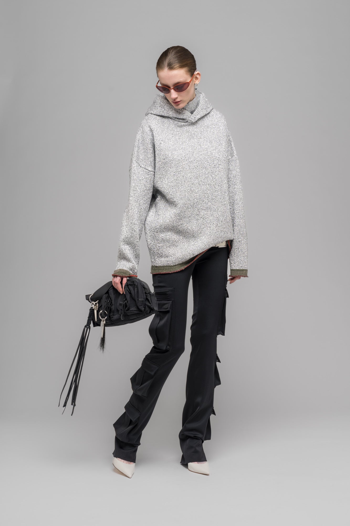 Knit hoodie with closable collar hood, contrast sleeve and hem details, and metallic yarn construction.