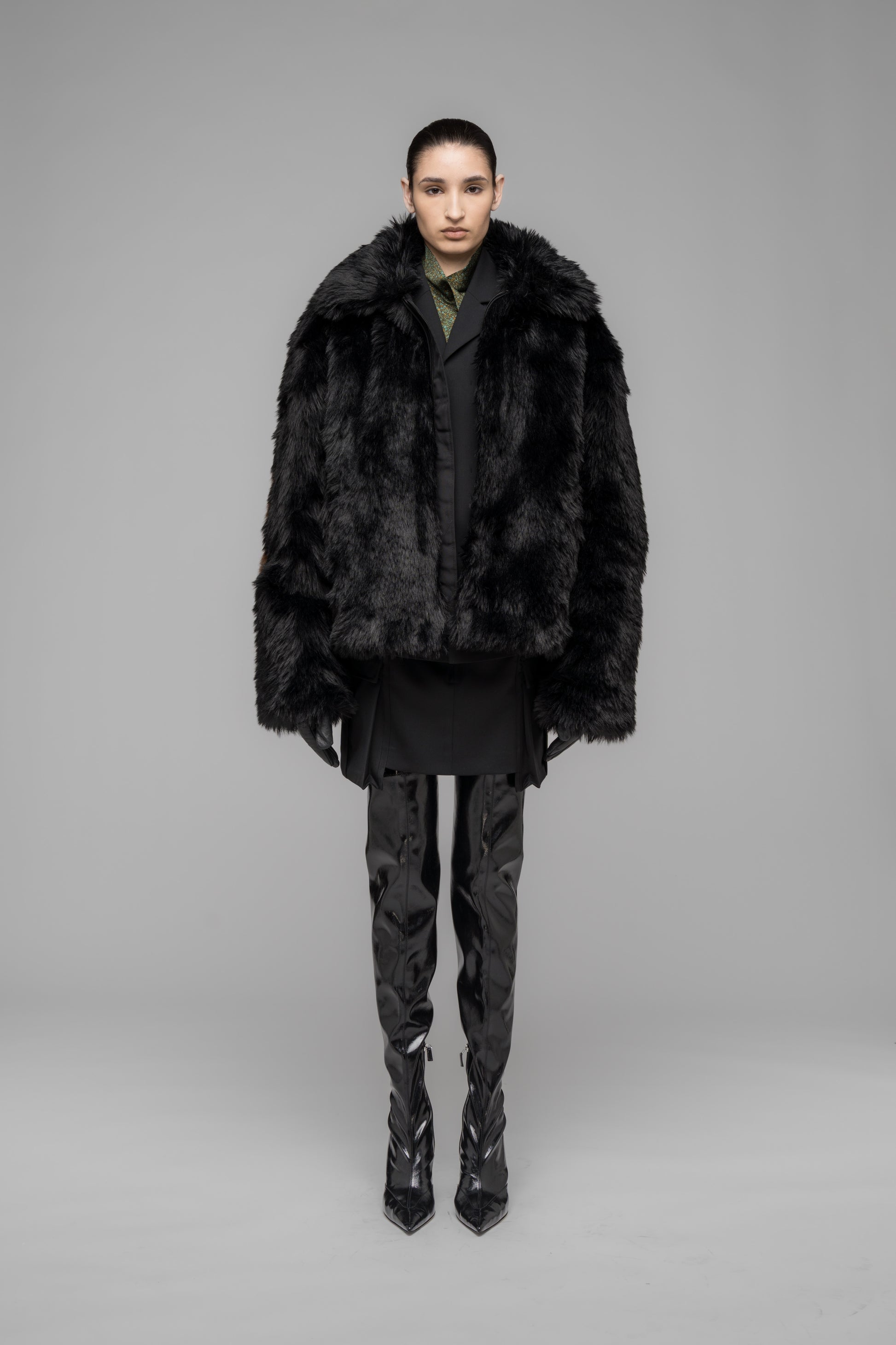 Oversized faux fur blouson with concealed zip closure, side welt pockets, and an intarsia “032c Workshop” logo on the back.