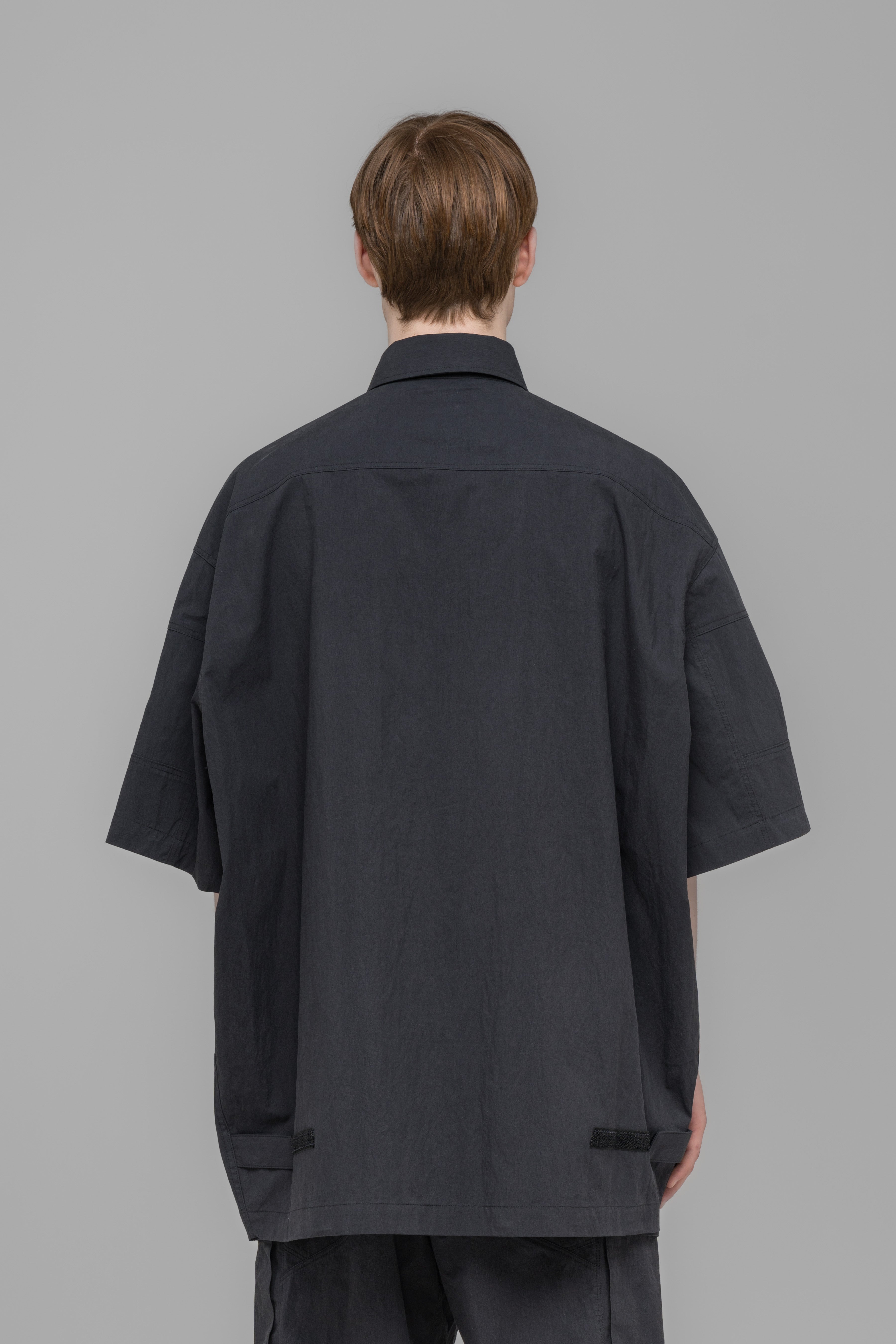 Utility-style shirt with Velcro-flap patch pockets and velcro adjusters inserted into side seam. The shirt features a contrast technical fabric on the sleeves and a center-front closure with concealed, sewn-on buttons.