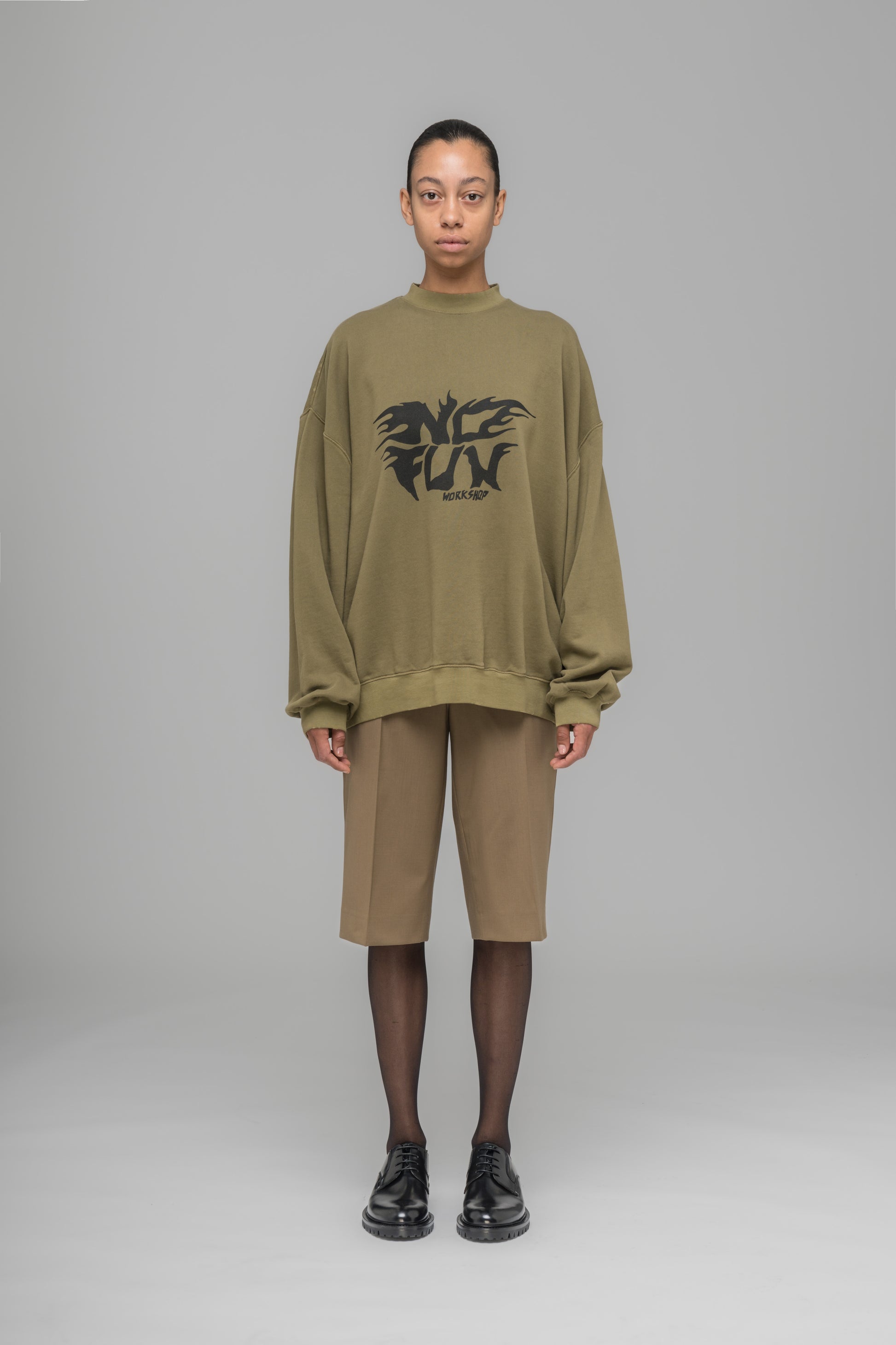 Our oversized fitted crewneck in faded green. Completed with single stroke screen print artwork and 032c logo embroidery. Distressed slightly for an overall vintage feel.