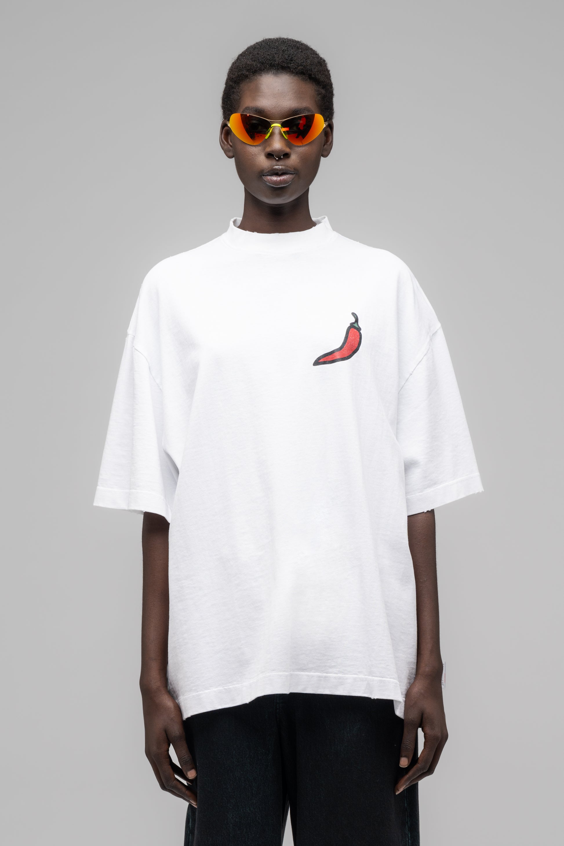 Screenprinted seasonal 032c “On Fire” artwork, 032c logo embroidery, and washed out “Office Fruit” artwork on left side seam