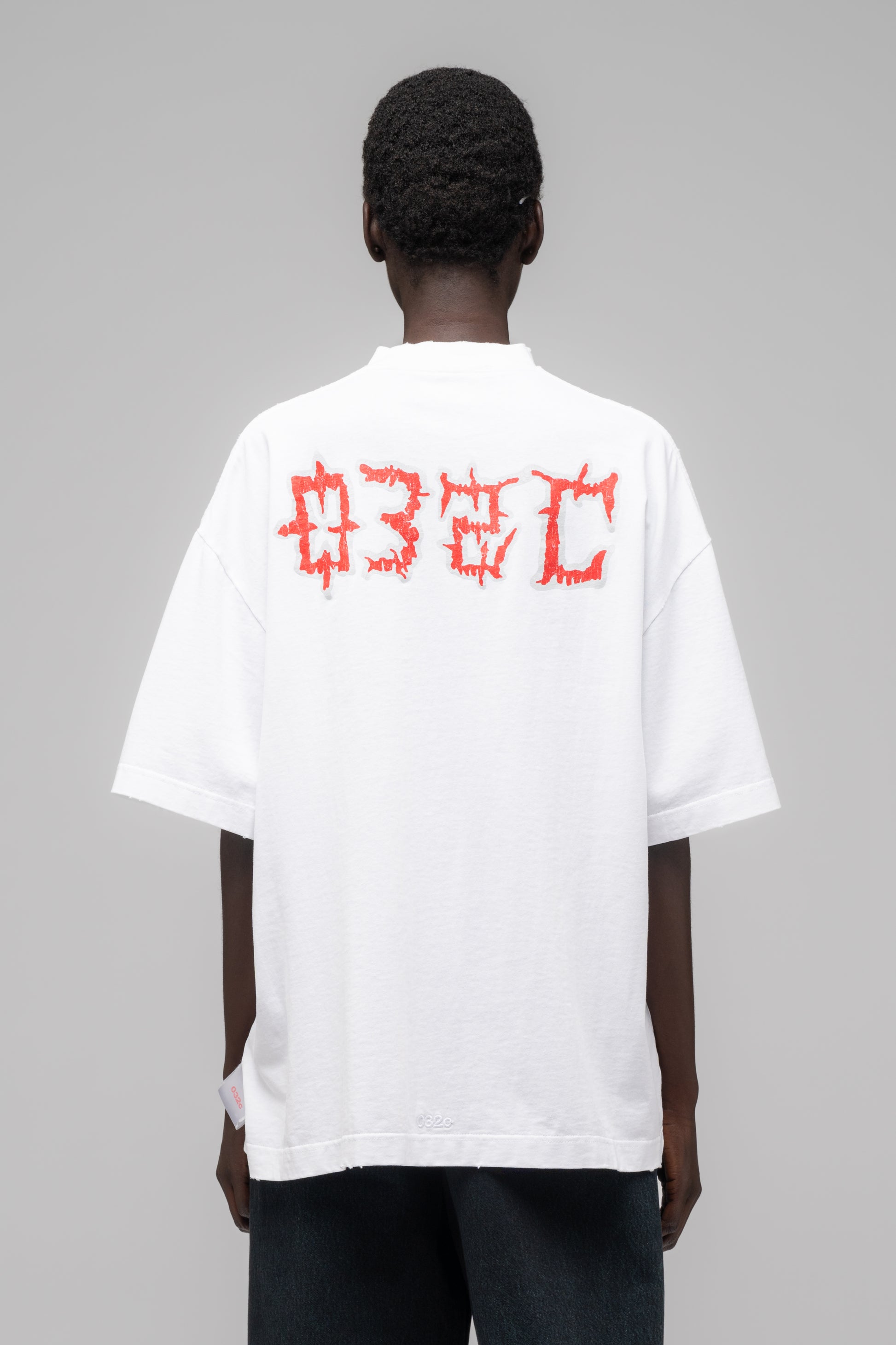 This distressed oversized t-shirt comes in a washed white for an overall vintage feel.