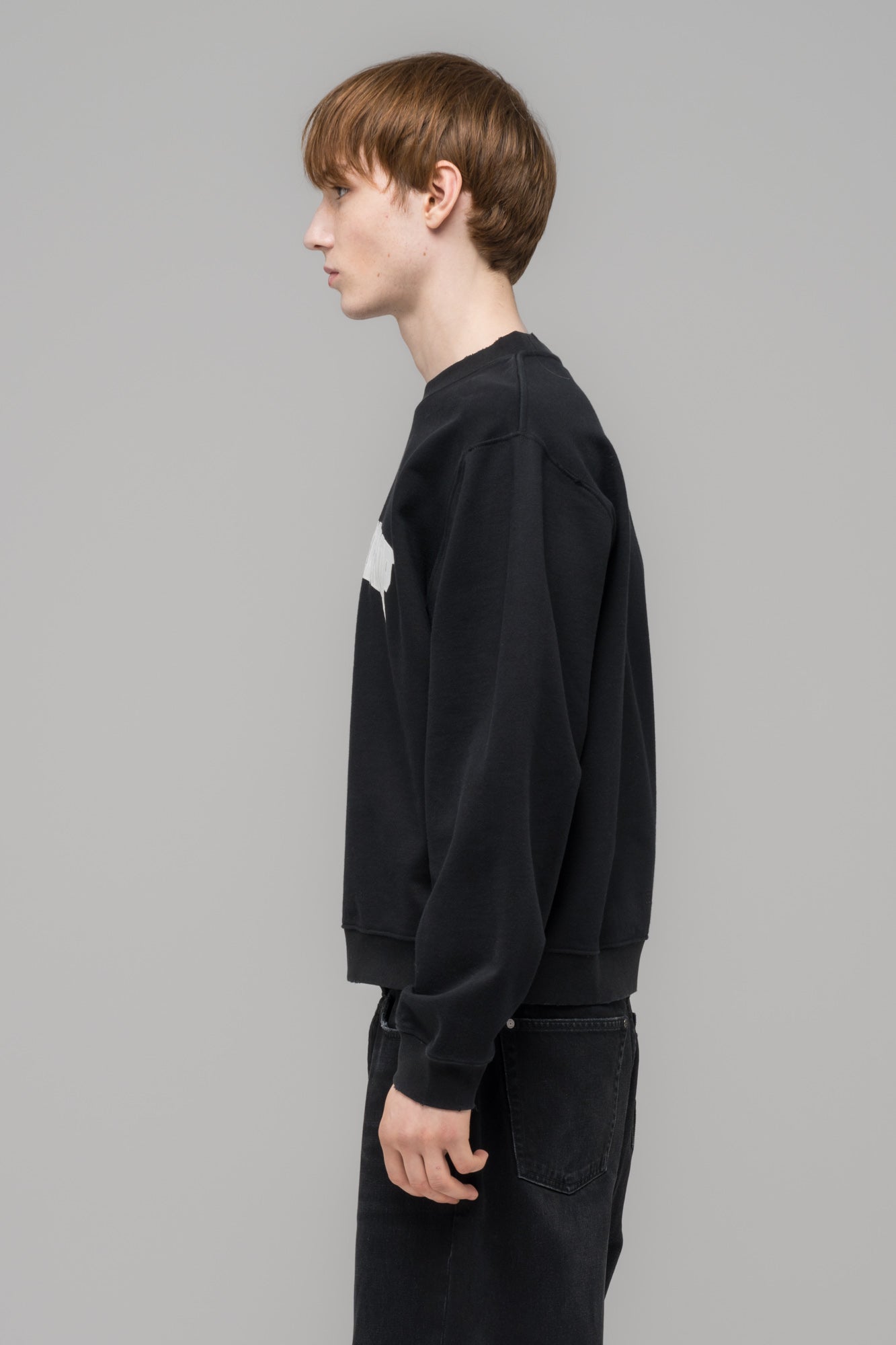 Crewneck in mid-weight organic cotton terry with looped backside and soft hand feel, featuring layered 032c Workshop print on the front, cracked “One Dollar Bill” print on the back, distressed edges, and a stone-washed finish.