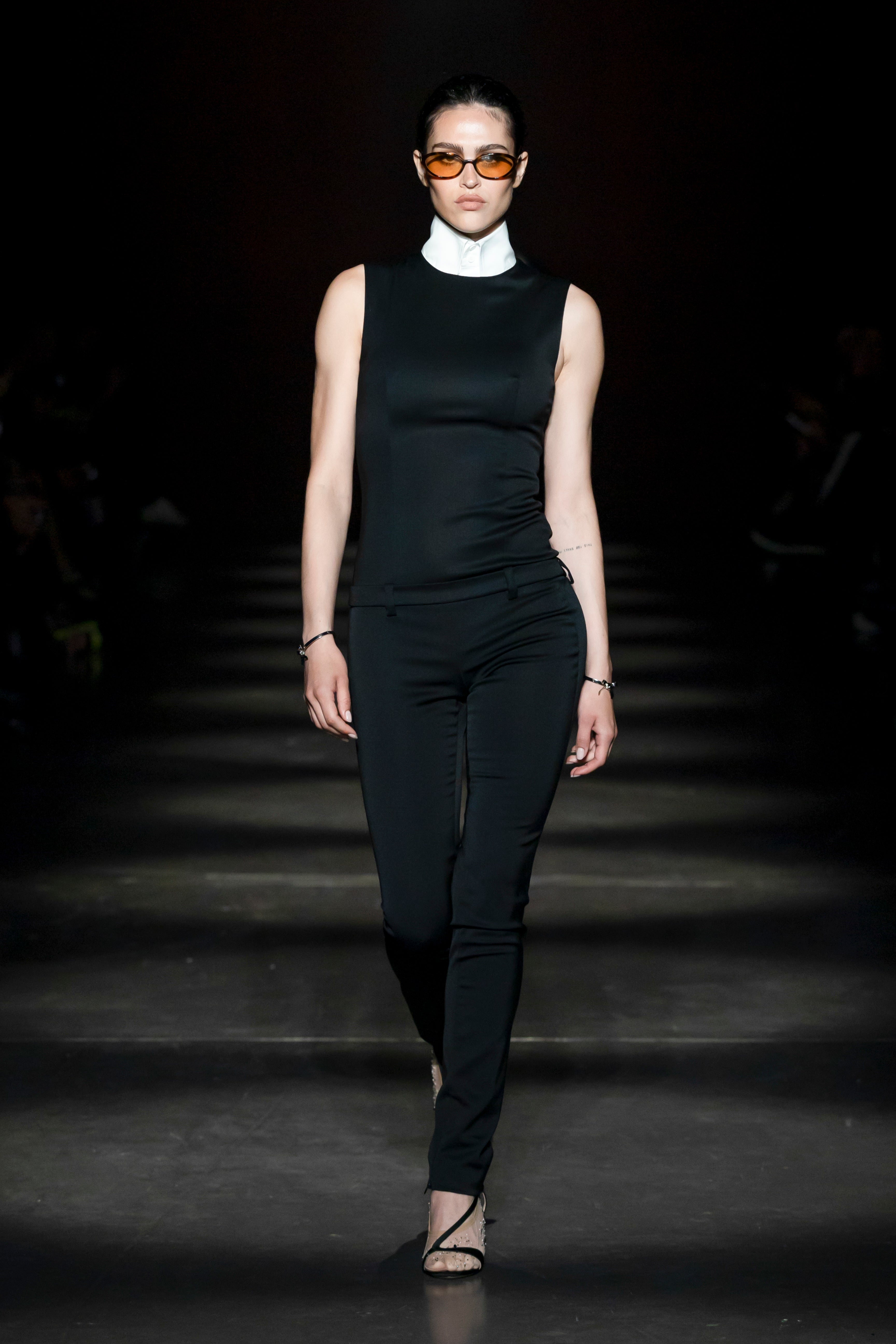 Tight-cut catsuit in silky Italian stretch suiting that merges suit top and trousers, featuring a waistband with belt loops and an inner-leg zipper that opens into a slight flare.
