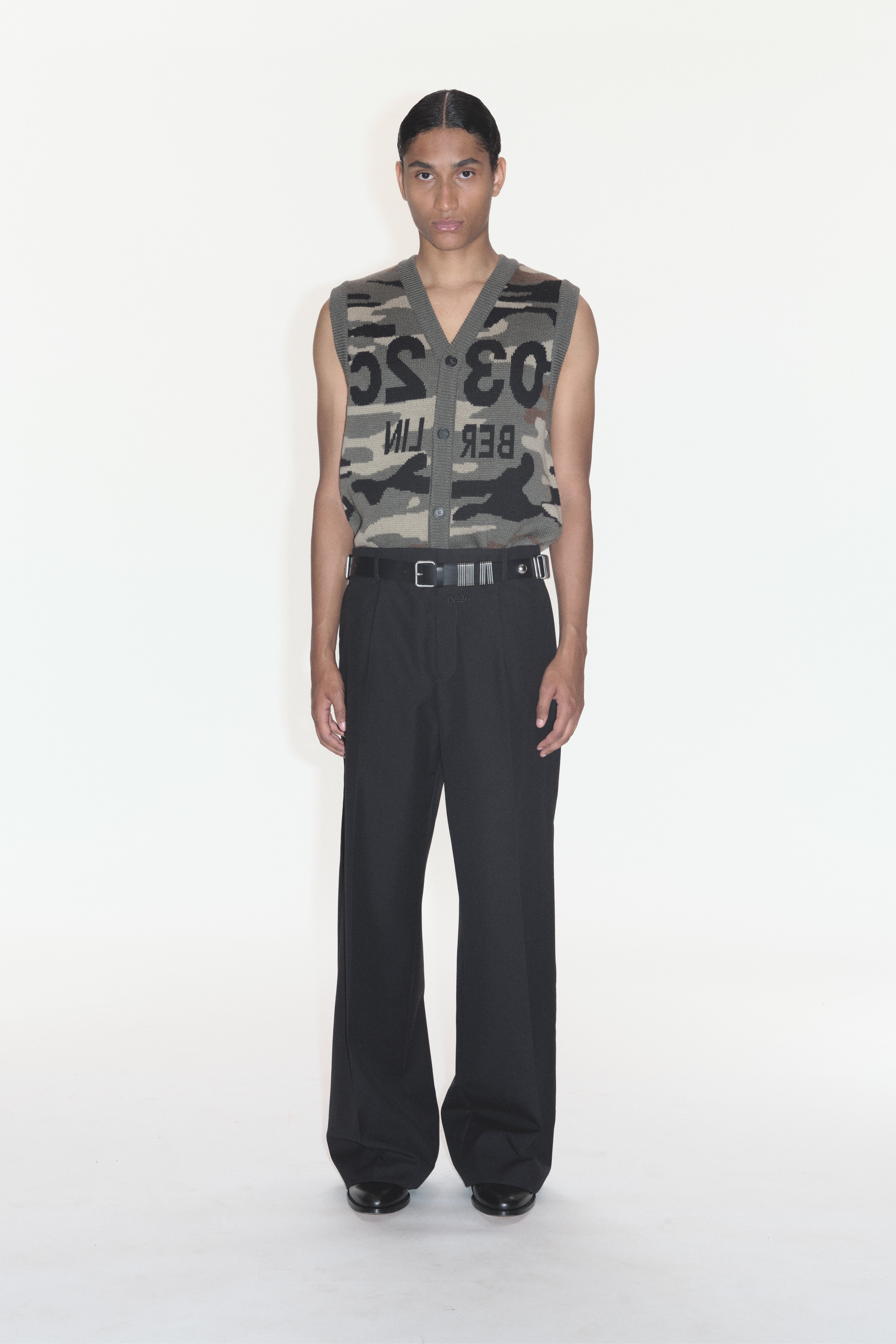 Relaxed-fit button-up v-neck vest in extra-fine merino wool, featuring ribbed trims, allover camouflage jacquard and mirrored ''032c BERLIN'' artwork on the front.