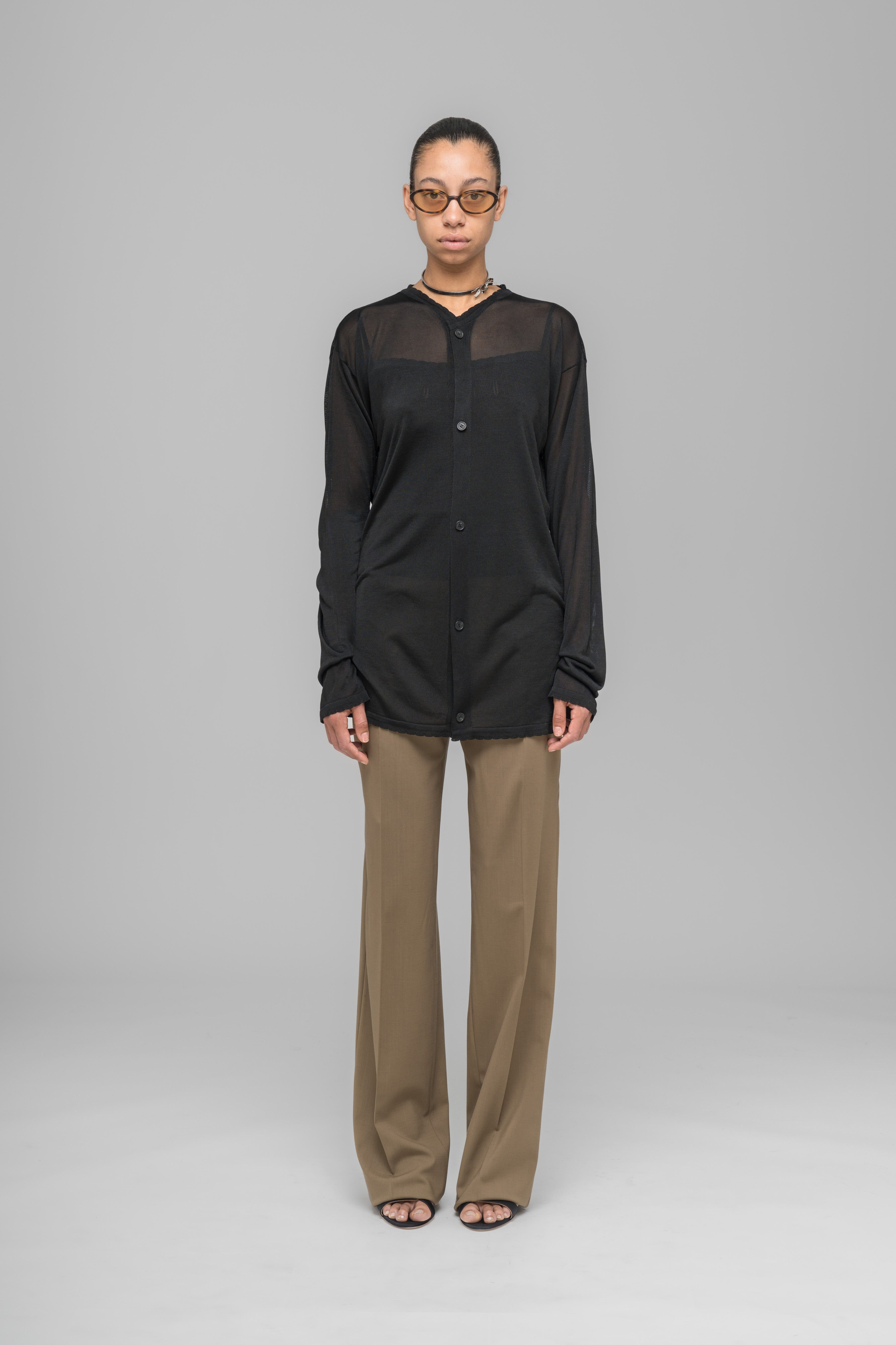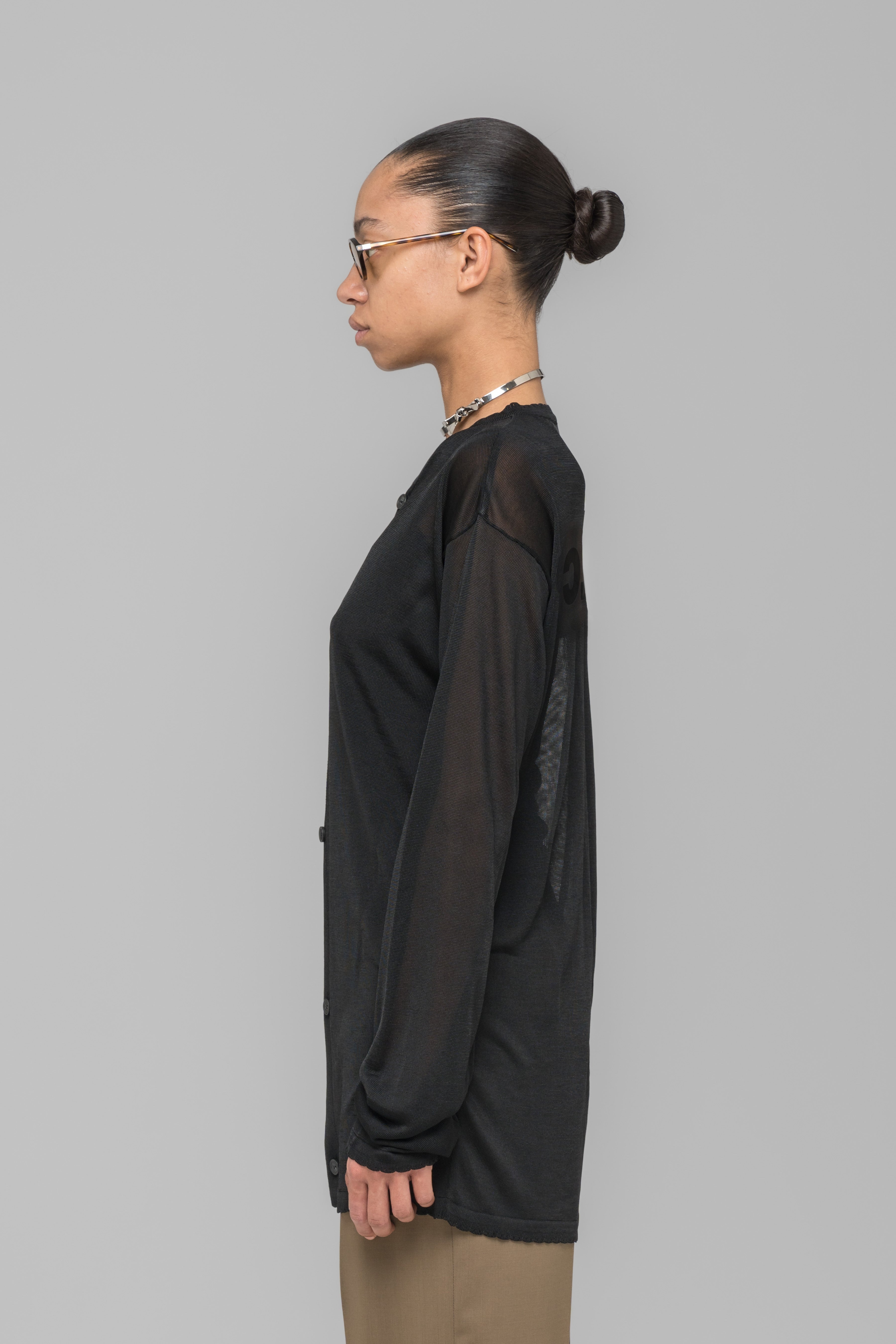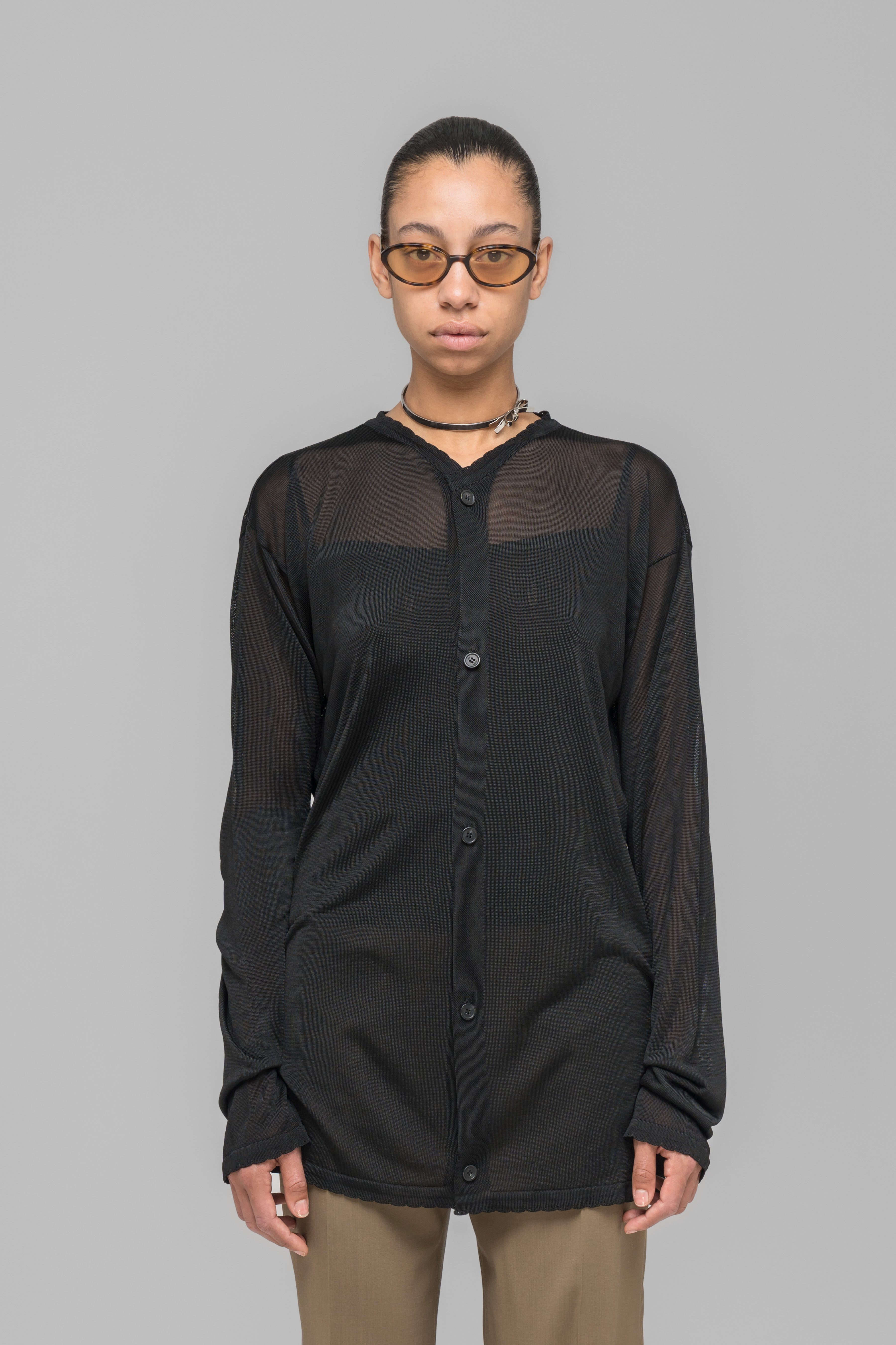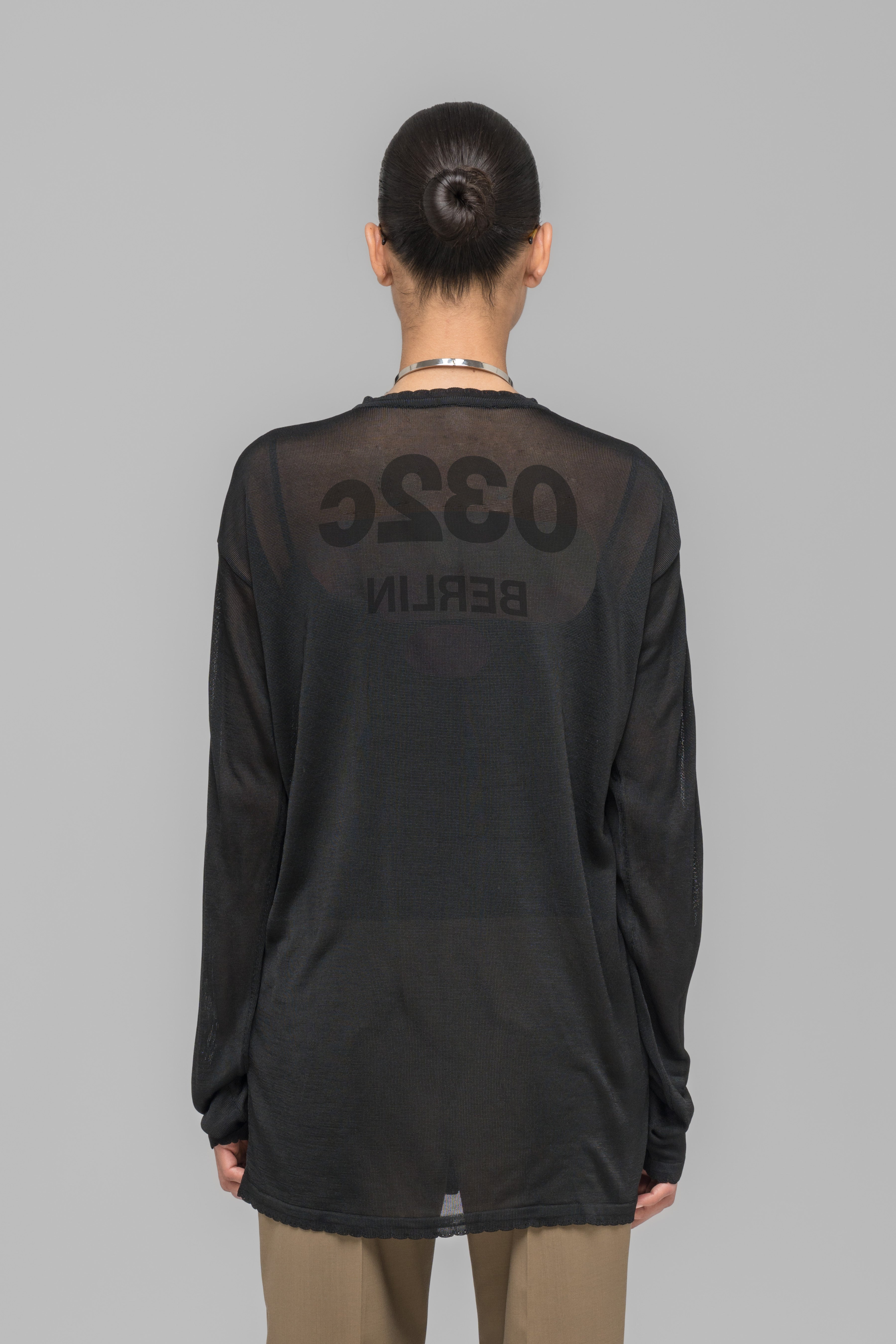 Women's black knit top, with a slight opaque feel. Crafted in a fluid viscose knit with folklore inspired trimmings at the neckline and hem, it features the iconic 032c flipped selfie logo on the back.