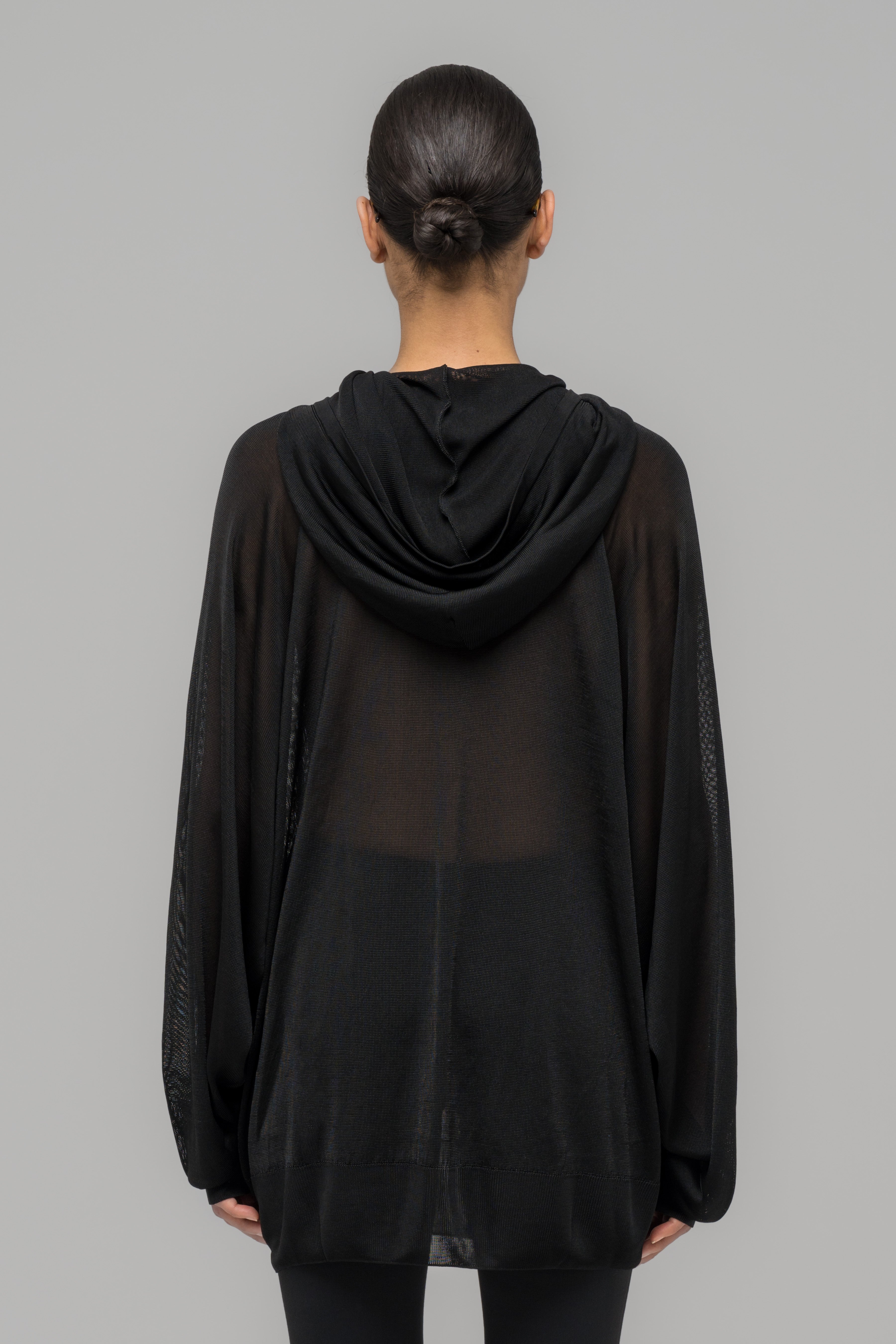 The animation knitted hoodie with a slouchy fit and a hint of transparency. Is made from a fluid viscose knit with 032c logo single screen print.