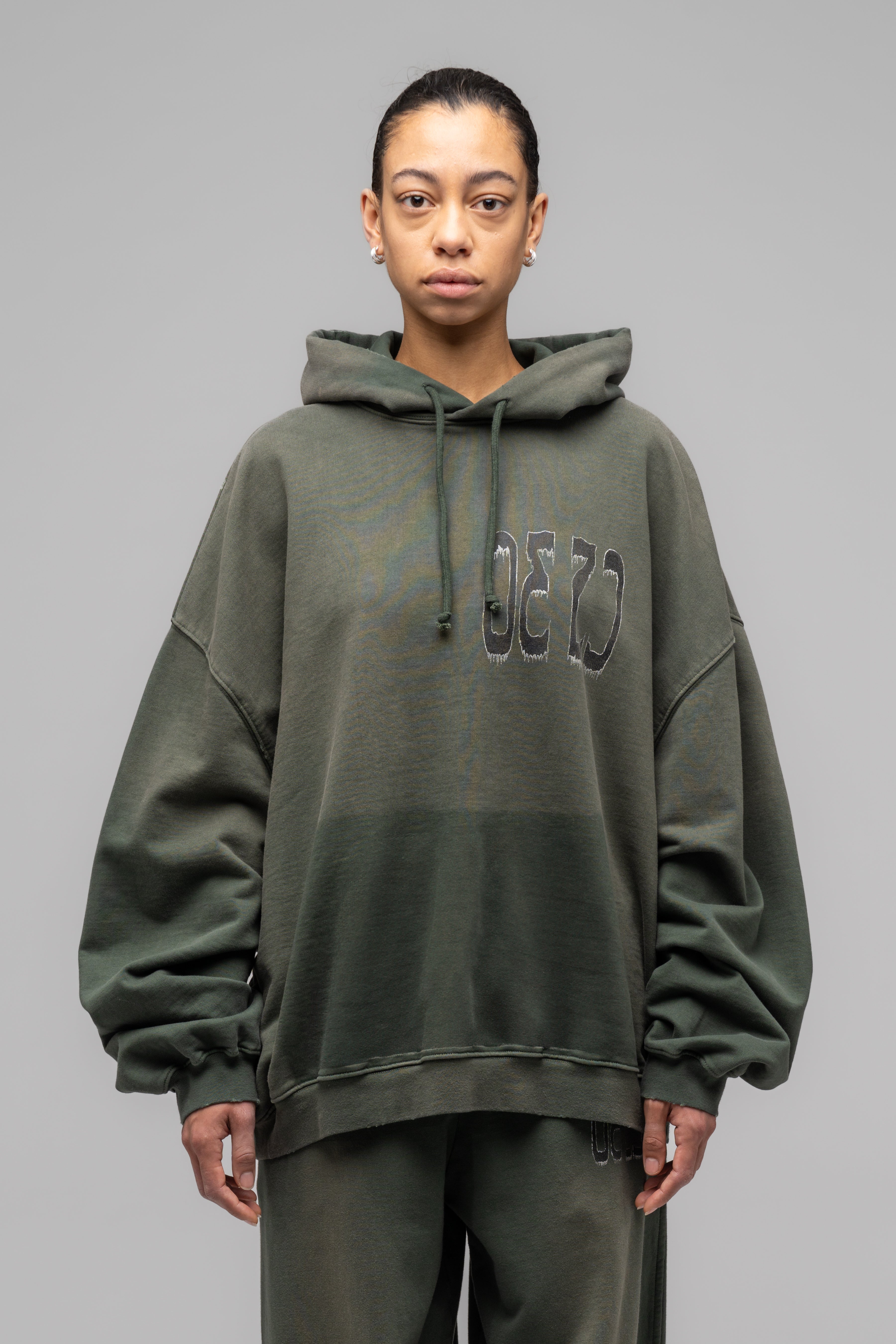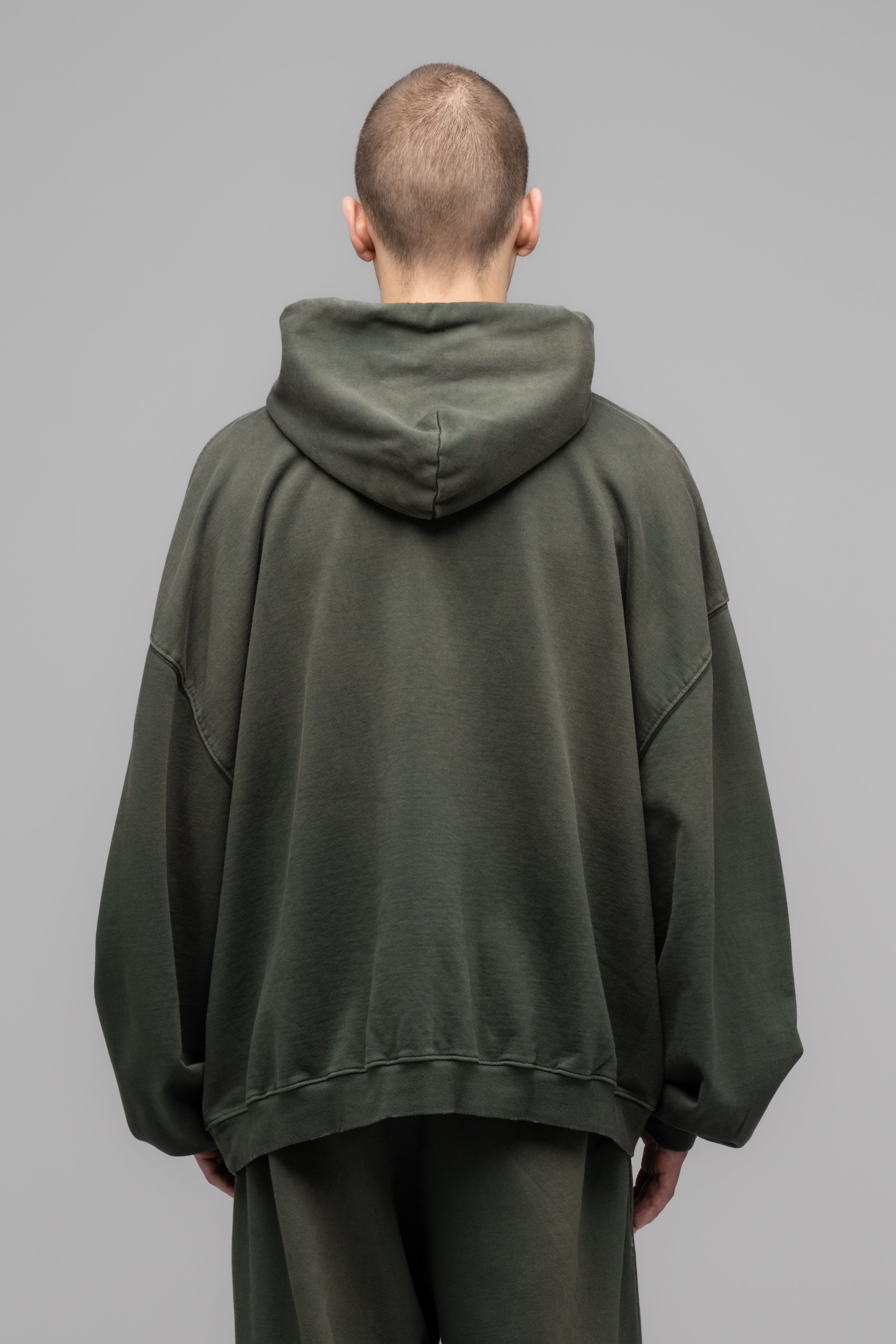 This distressed oversized hoodie with a lost kangaroo pocket comes in a faded olive for an overall vintage feel.