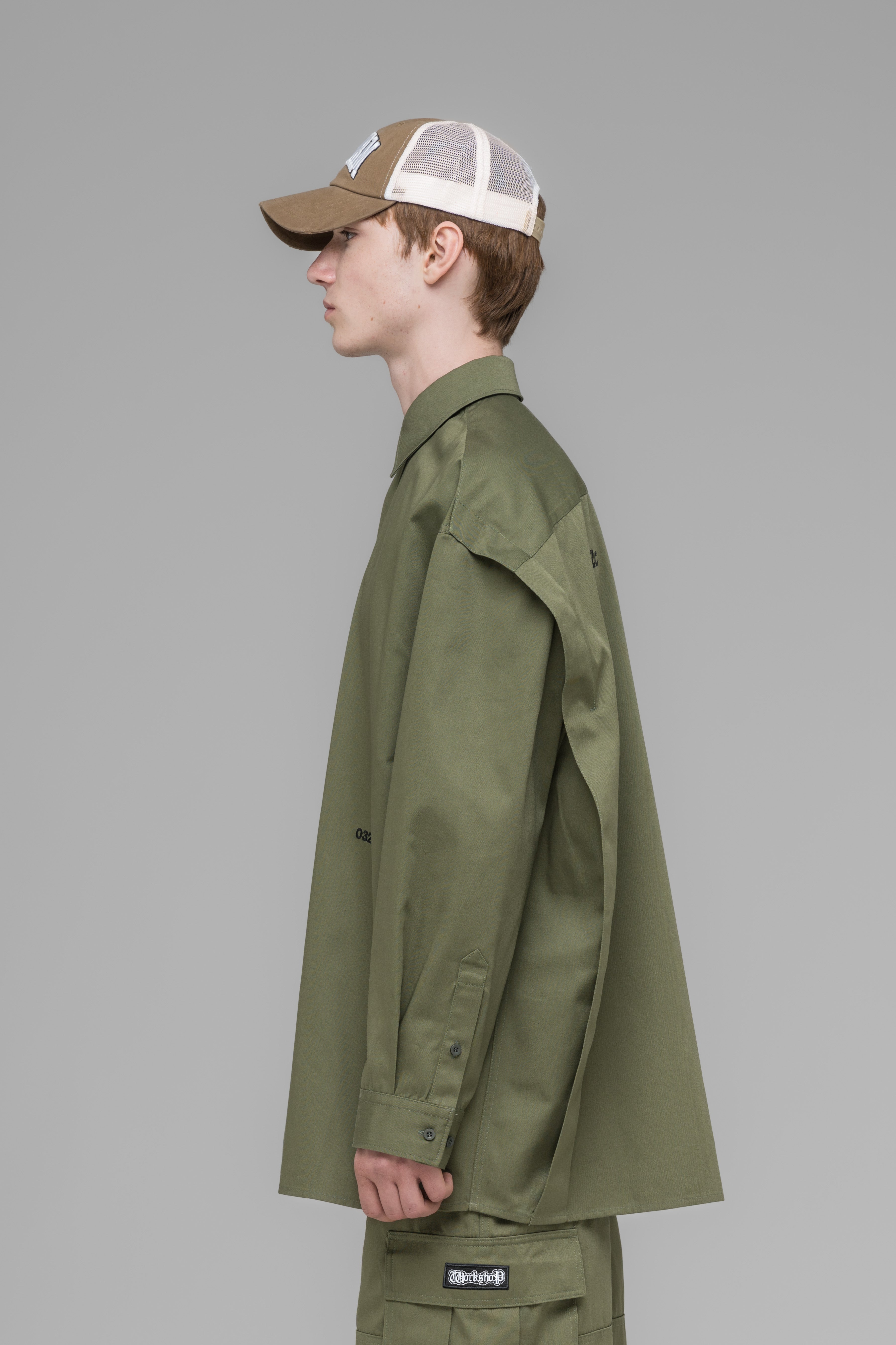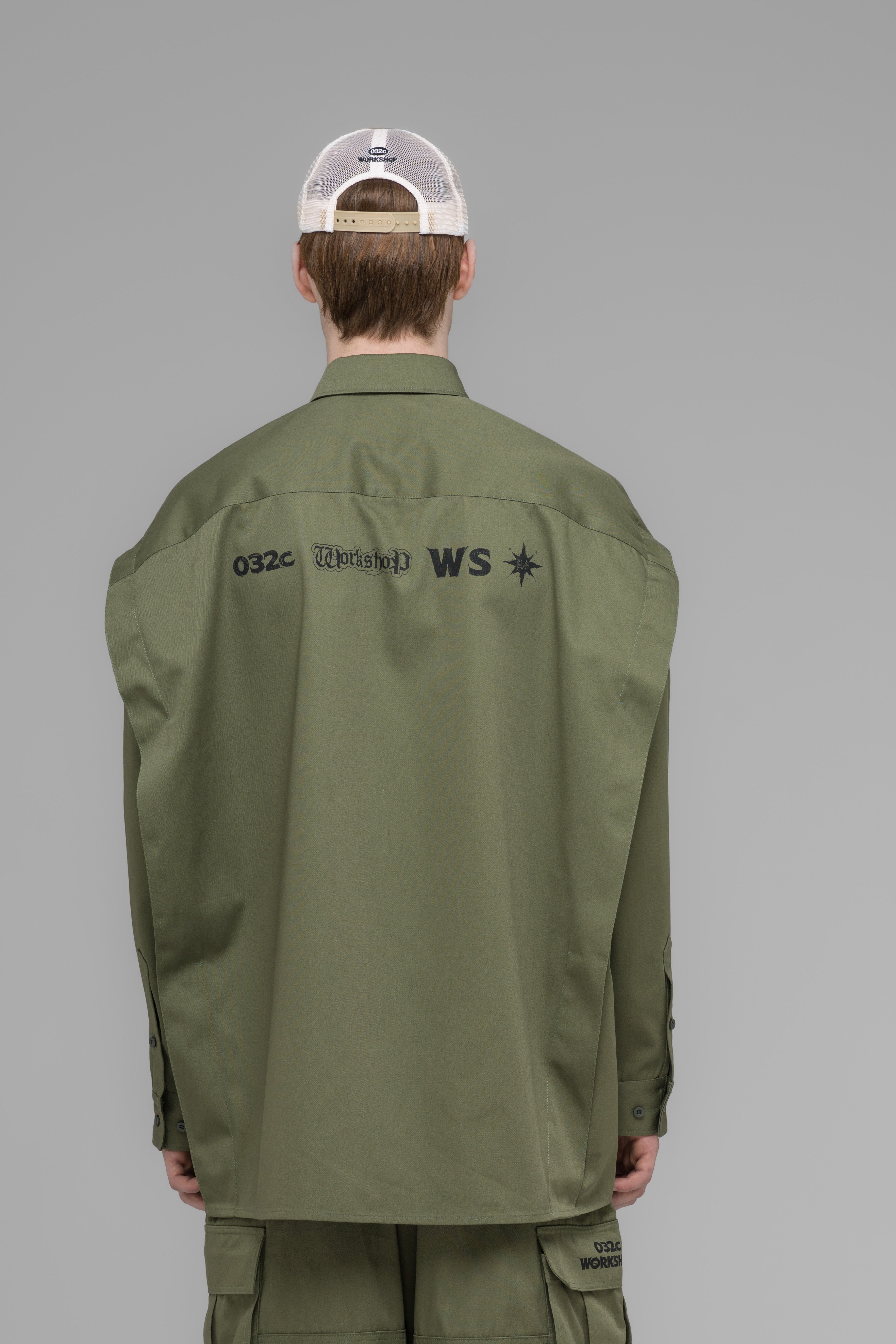 Cargo overshirt with four front patch pockets, double-layer sleeves with raw edges, adjustable cuffs, pleated shoulders, an embroidered chest patch, and a seasonal artwork screenprint on the back.