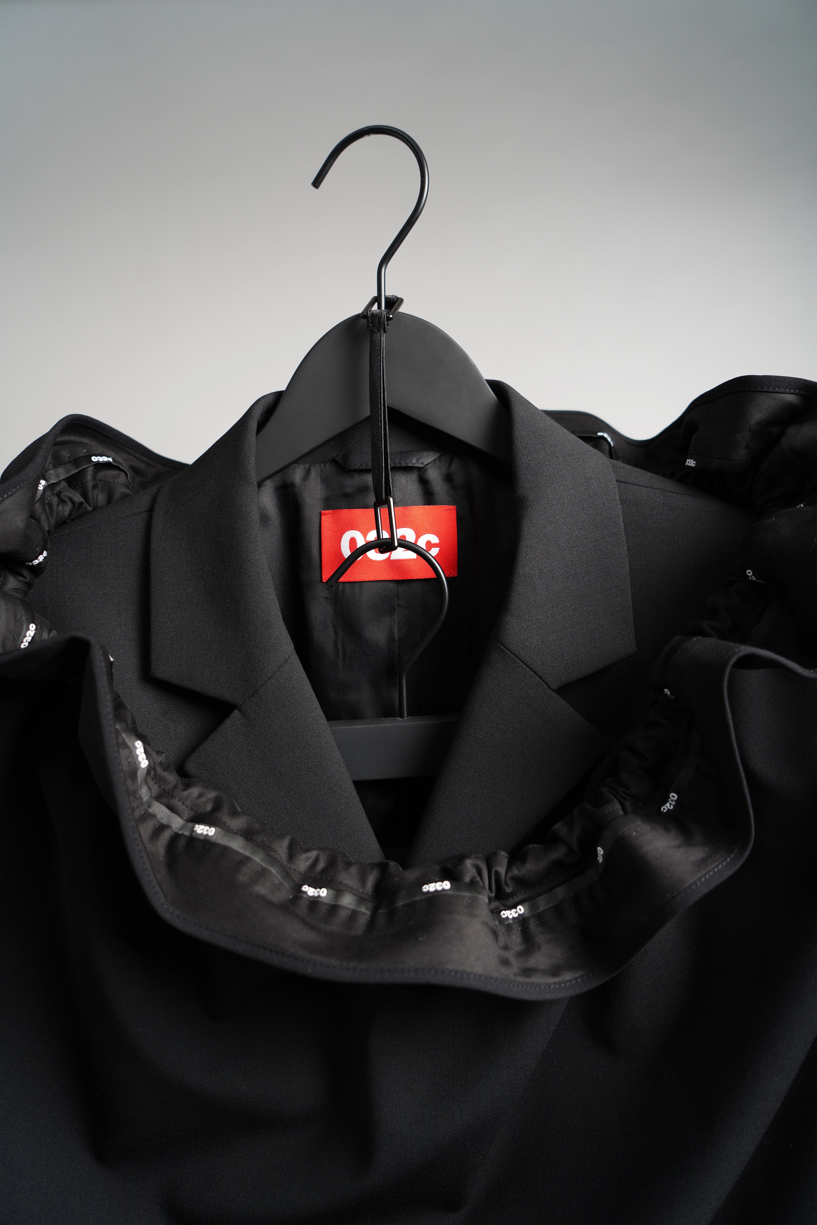 Tailored trousers with Italian side pockets, back welt pocket, embroidered 032c logo patch on the back, and branded internal waistband.