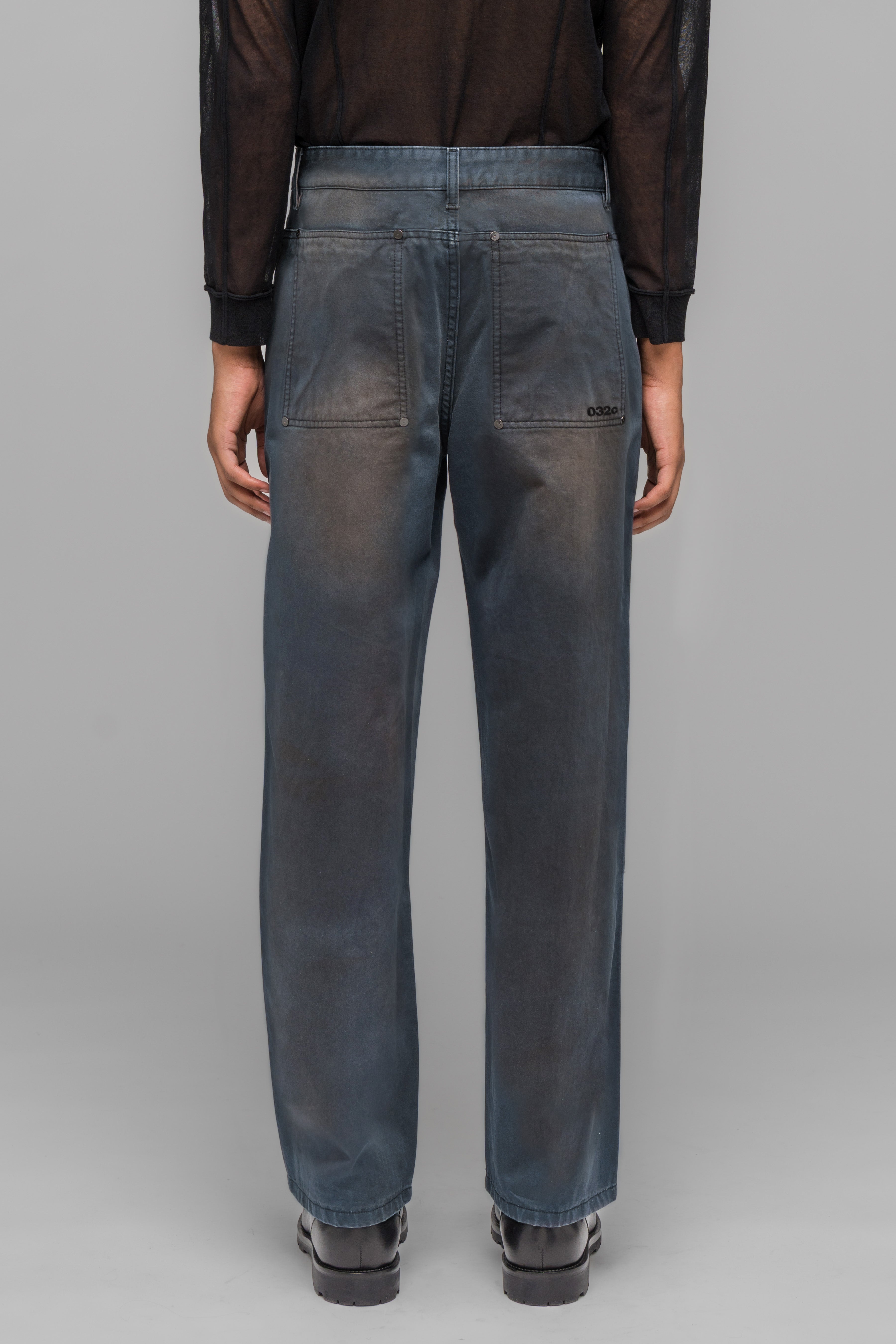 Pants with 5-pocket construction, zip fly, 032c logo embroidery, and a stained stone wash treatment.